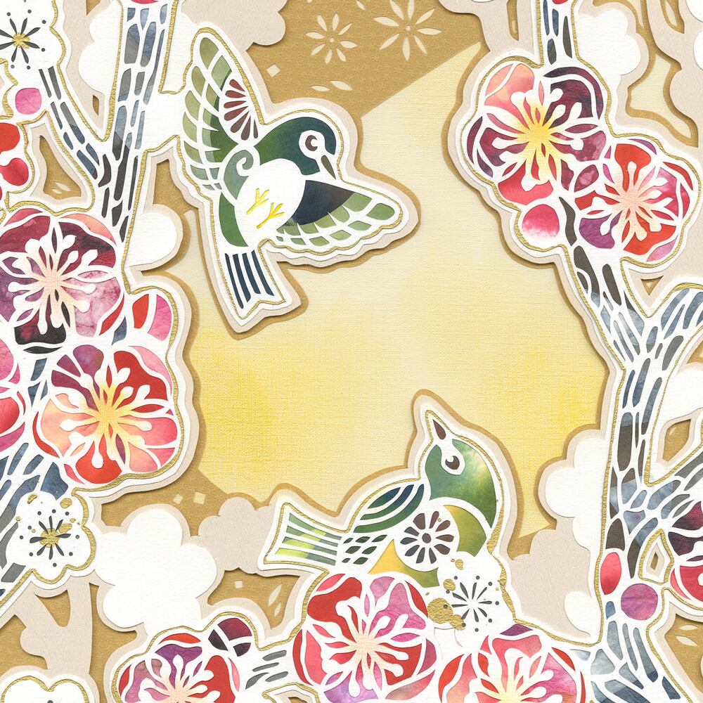 枝いっぱいに咲き誇る梅の花は、白から紅までの濃淡豊かな彩りで表現され、春の到来を告げるように輝きを放っています。その間を飛び交うメジロは愛らしく、花の香りに誘われるように生き生きと描かれています。背景に広がる金色の円は月明かりを象徴し、夜の静けさと梅の艶やかさが調和する幻想的な雰囲気を漂わせます。繊細な切り絵の線と色彩の重なりが、春の息吹と生命の喜びを優雅に映し出し、観る人に温かな余韻を残します。