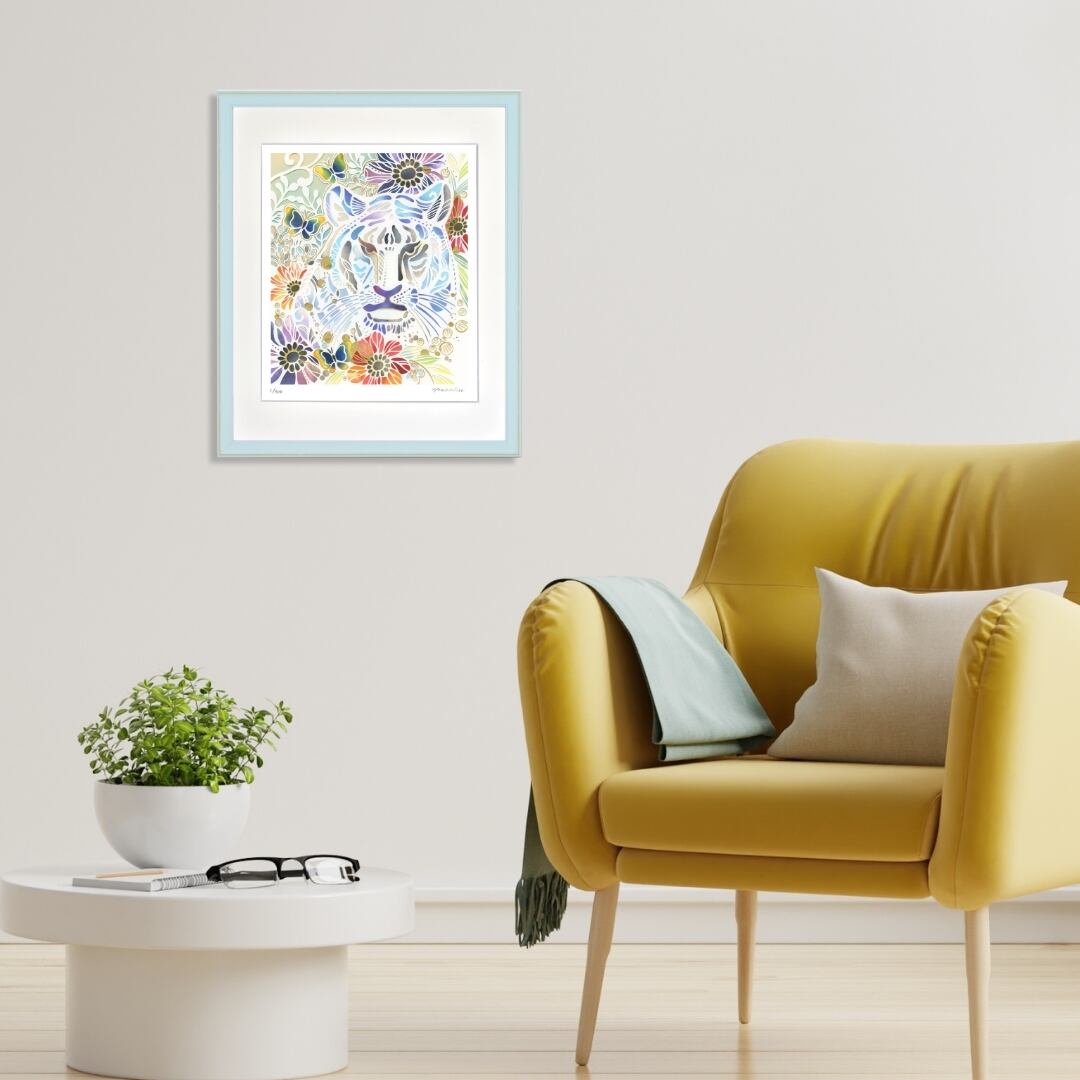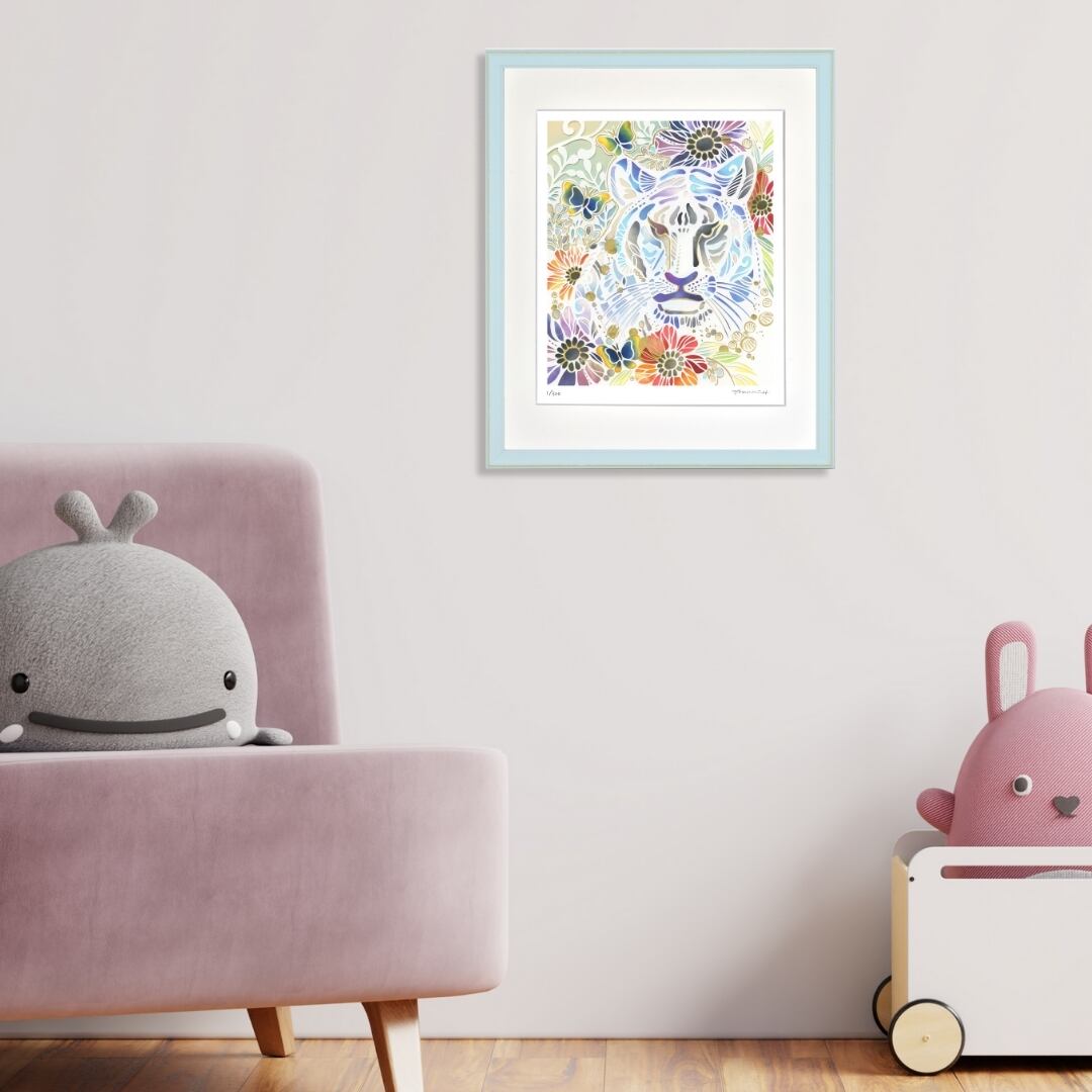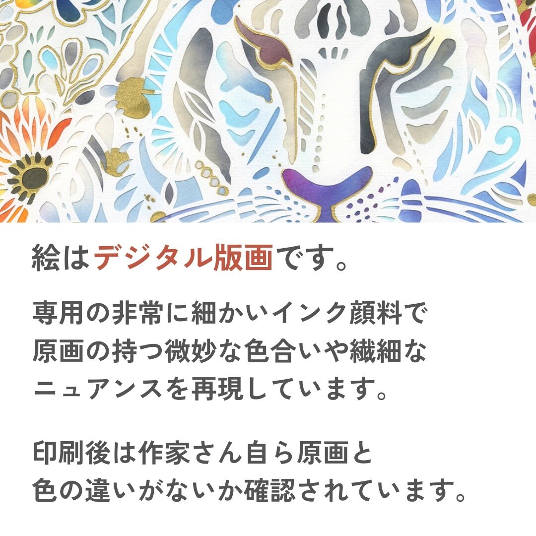 力強さと美しさを併せ持つこの作品は、空間に凛とした気品をもたらし、観る人に勇気と前向きなエネルギーを与えてくれます。虎の存在感は守護や強さを象徴し、花々の華やぎは明るく穏やかな雰囲気を広げ、バランスの取れた調和を感じさせます。蝶の柔らかな動きは軽快さを添え、心に安らぎを運んでくれるでしょう。インテリアに取り入れることで、洗練された印象と同時に、生命の力強さや希望を日常に感じられる作品です。