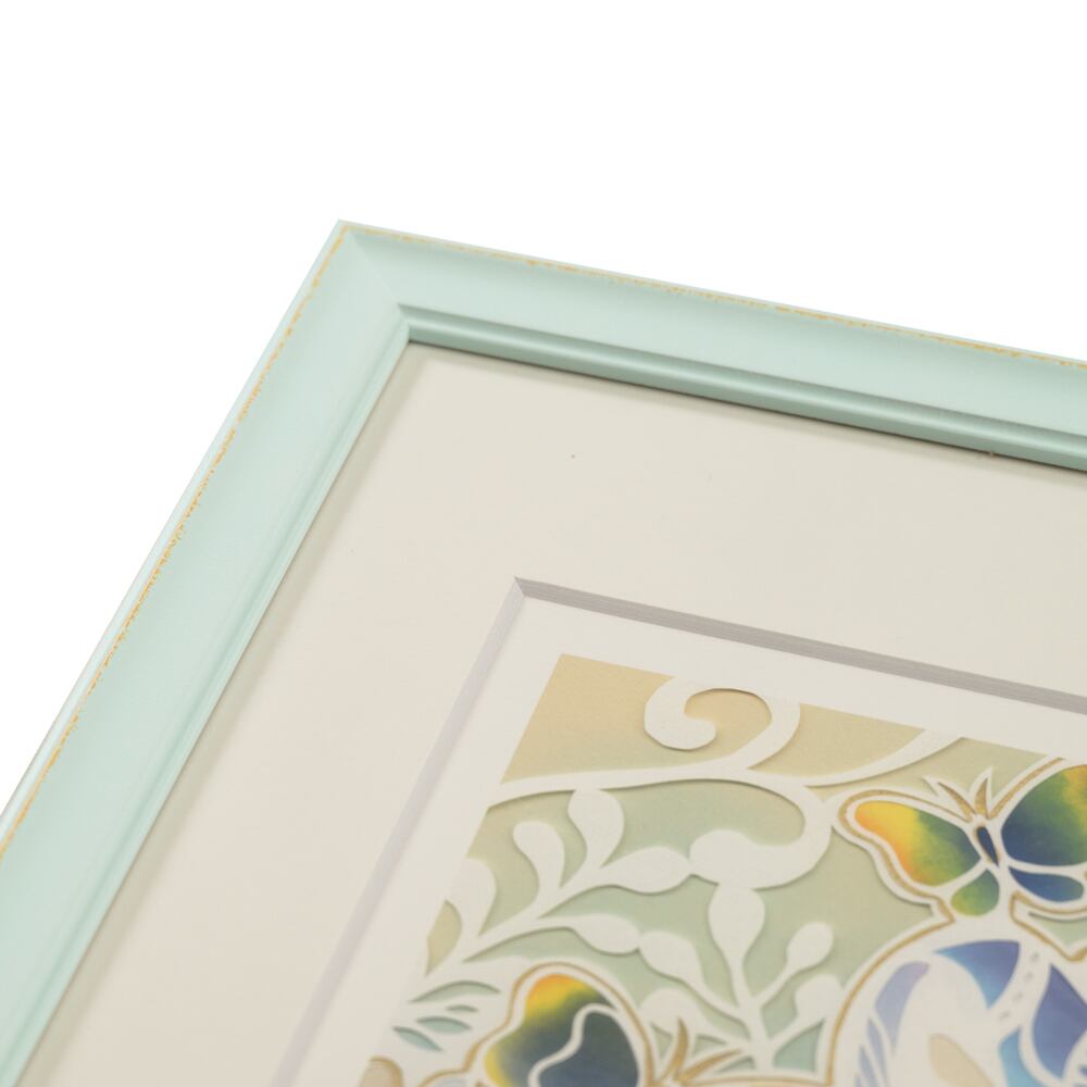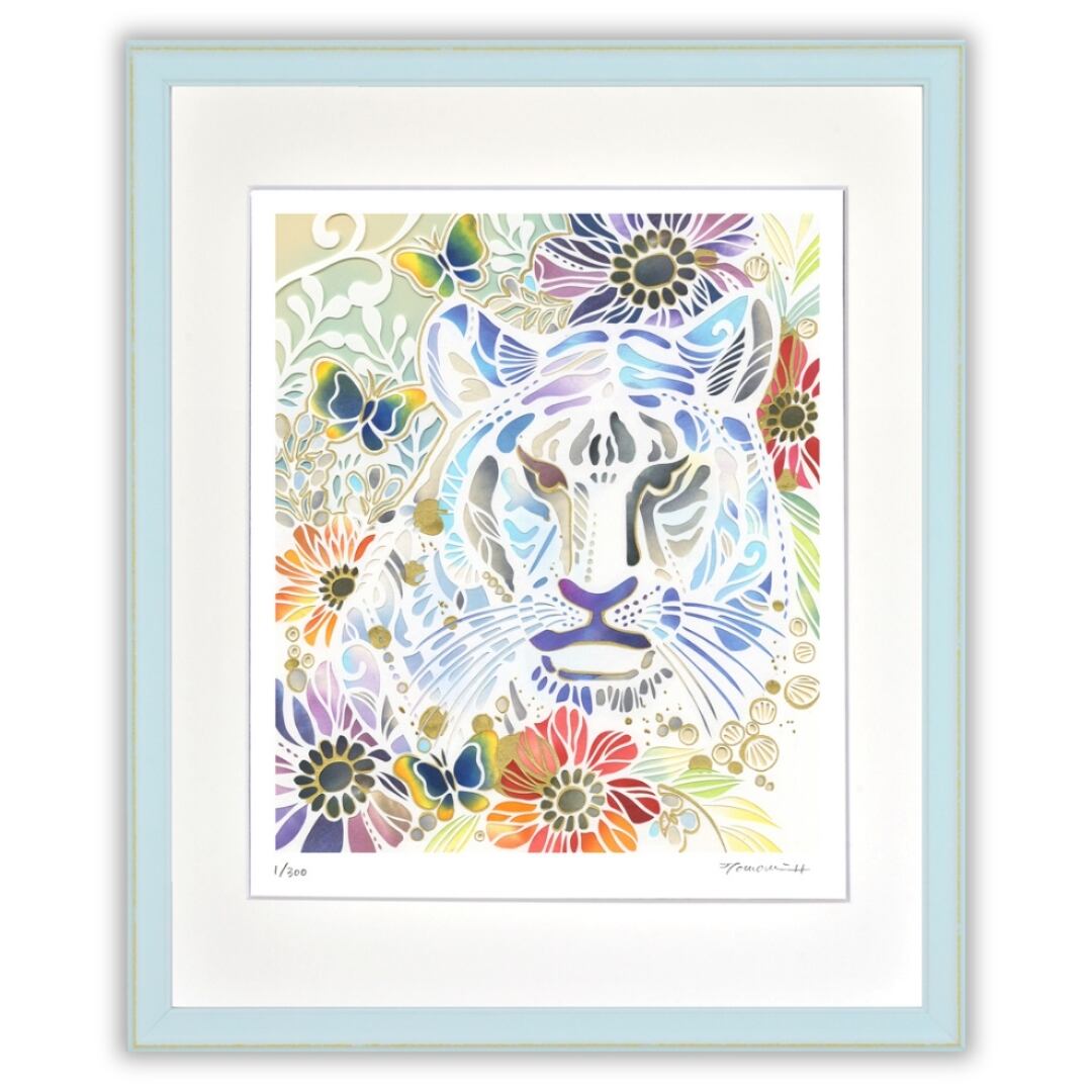 白虎を中心に描かれた本作は、その神秘的な存在感と柔らかな色彩が絶妙に調和した印象を与えます。青や紫の涼やかな色調で描かれる毛並みは、虎の精悍さを際立たせながらも優雅な美しさを感じさせ、周囲に咲き誇る色とりどりの花々が生命の豊かさを添えています。舞う蝶たちは作品に軽やかなリズムを与え、猛々しさの中に優しさと調和を見いだすことができます。緻密な切り絵の技法が織りなす光と影が、幻想的な世界観を一層際立たせています。