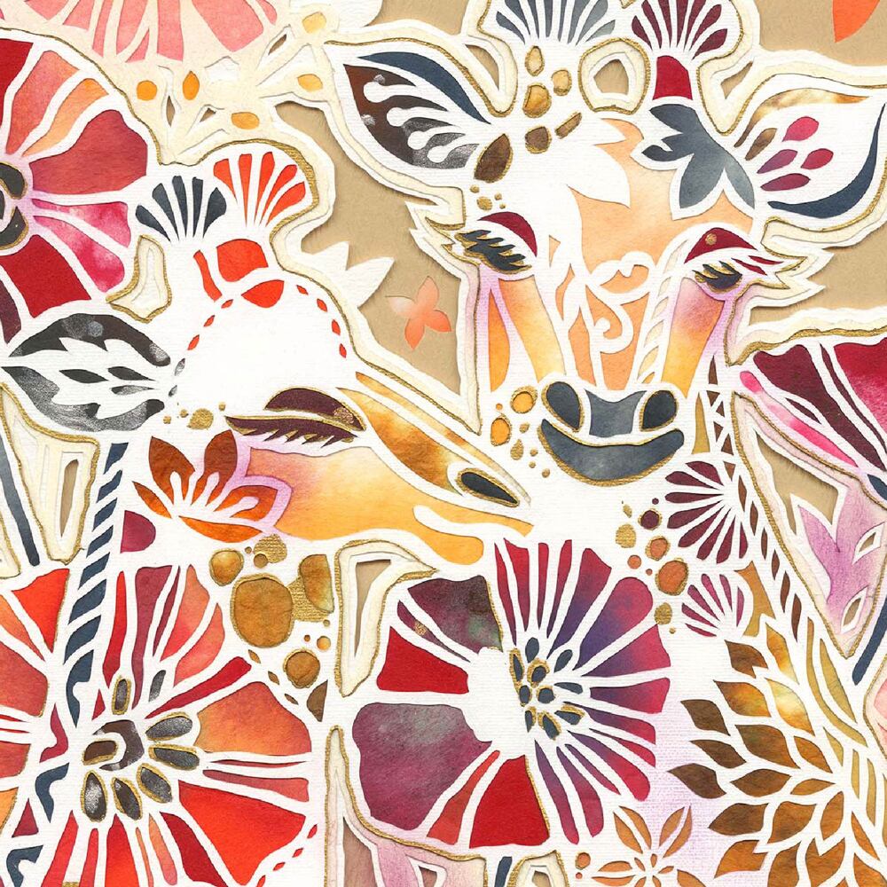 鮮やかな花々に囲まれたキリンの姿が印象的に描かれた一枚。柔らかなベージュの背景に赤や紫、ピンクの花が舞い、その中で優雅に佇むキリンが自然との調和を物語っています。繊細な模様と華やかな色彩は、穏やかさの中に生命力あふれるエネルギーを秘め、見る人の心を惹きつける存在感を放つもの。切り絵ならではの透け感や立体的な構成が光を受けて輝き、幻想的な世界観を広げる作品に仕上がっています。