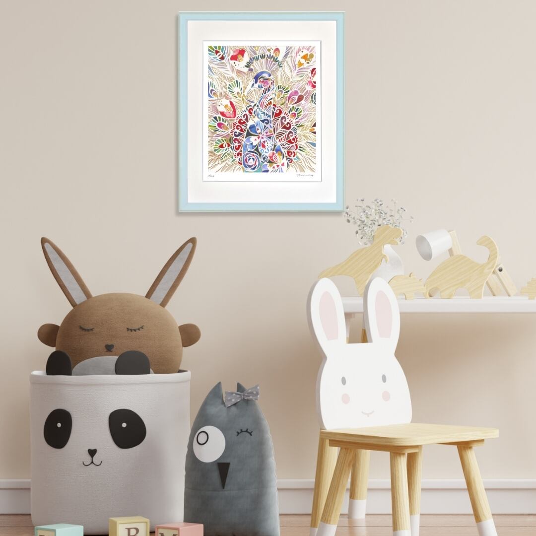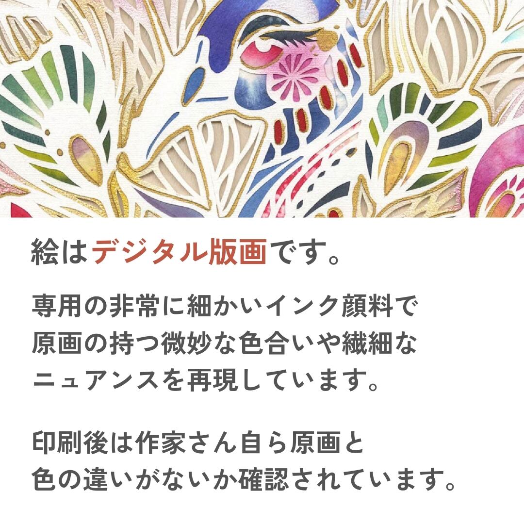 孔雀が象徴する優雅さと繁栄を思わせるこのアートは、インテリアのアクセントとして大きな力を発揮します。鮮やかな配色と豪華な構図はリビングや玄関に華やかさを添え、来客を迎える空間を印象的に演出。額縁付きで存在感がありながらも、細やかなカッティングと色の調和が柔らかさを生み、日常に潤いを与えてくれます。鮮明なイラストが織りなす孔雀の姿は、心に活力を呼び起こし、インテリアアートとして長く楽しめる逸品といえるでしょう。