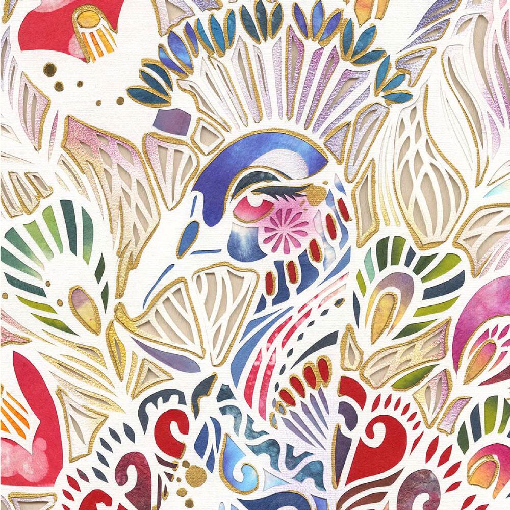 「作る・飾る・ときめく」をテーマにしており、伝統的で新しい切り絵表現を常に追求し、美しい色彩の重なり合いを魅せられるような作品です。