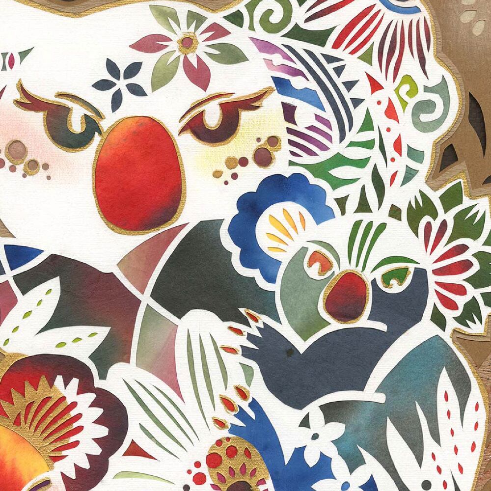 大きな木の幹に抱きつくコアラの親子をモチーフにしたインテリアアート作品。穏やかな眼差しを浮かべる親コアラと、その懐に寄り添う子どもの姿が温かな物語を感じさせます。周囲には色鮮やかな花々が散りばめられ、落ち着いたブラウンの背景と対比することで生命力をいっそう際立たせています。繊細な切り絵が織りなす陰影と立体感により、イラストでありながら深みのある存在感を放ちます。額縁付きで仕上げられた一枚は、見る人の心に安らぎと豊かさを届けるアートといえるでしょう。