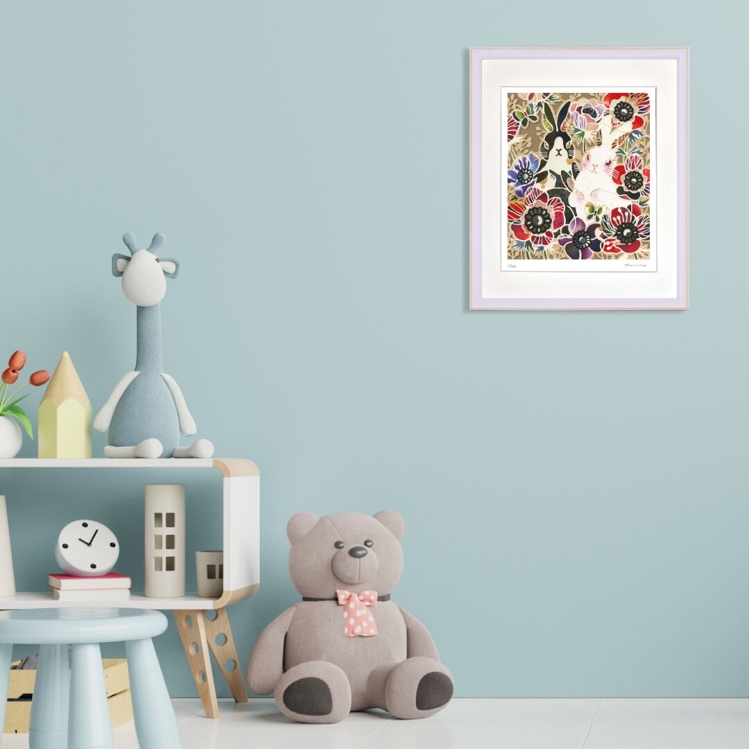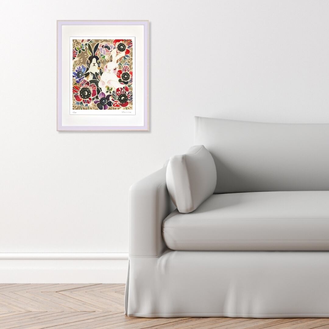 鮮やかなアネモネの花々に囲まれた二匹のうさぎを描いたインテリアアート作品。白と黒のコントラストが印象的なうさぎたちは、花々の華やかさに調和しつつ、個性を際立たせています。アネモネの深い赤や紫、青が繊細なタッチで表現され、背景に落ち着いた色合いを配することで、全体に豊かな奥行きを生み出しています。イラストの柔らかい線と色彩の組み合わせにより、静けさと華やかさが共存する独特の世界観が感じられます。額縁付きで完成された一枚は、アートとしての存在感をしっかりと放ち、見る人の心を捉えて離しません。
