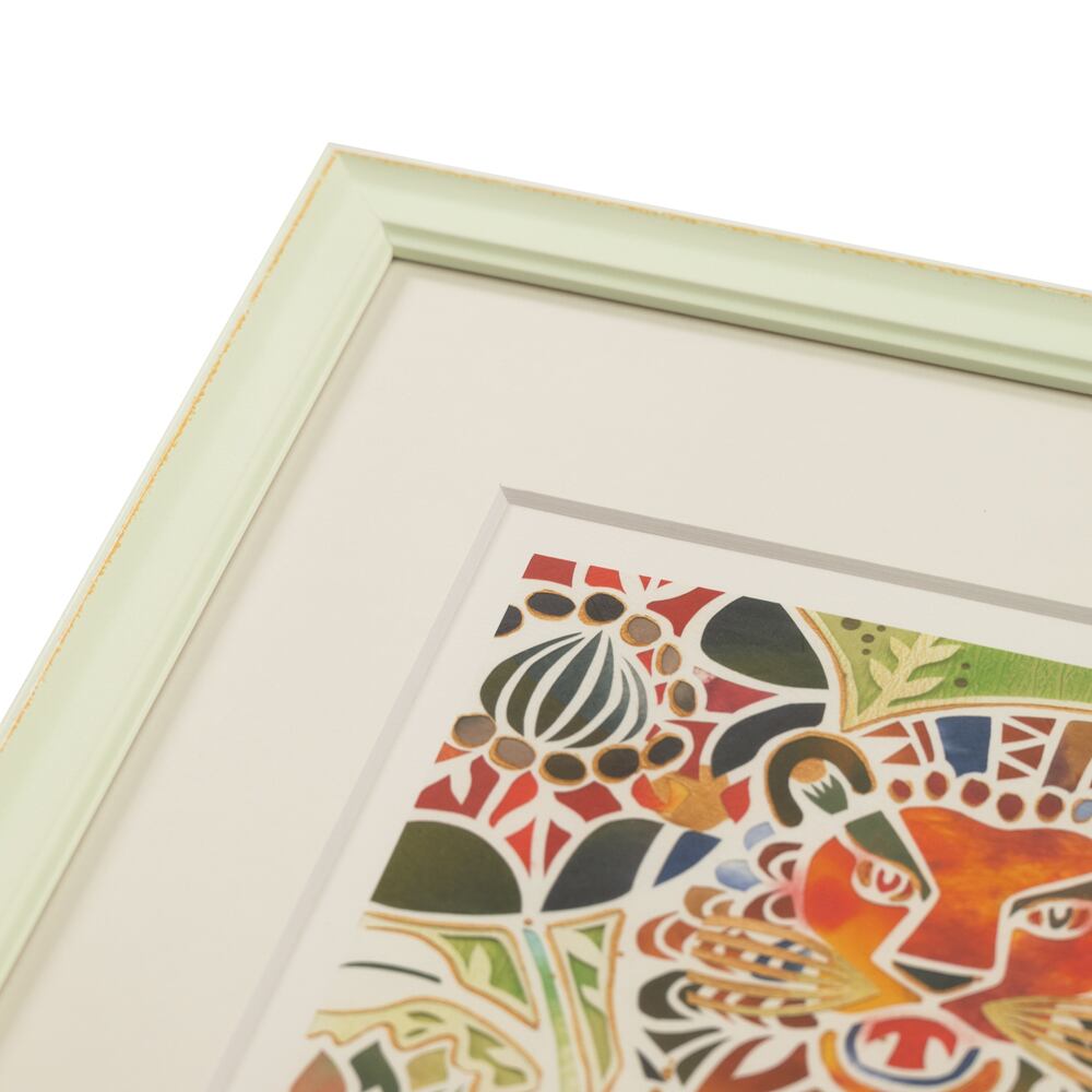 力強さと優雅さを兼ね備えたライオンが、鮮やかな花々に囲まれて描かれたインテリアアート作品。炎のように赤く輝くたてがみと鋭い眼差しが印象的で、生命力あふれる存在感を放っています。一方で周囲に広がる花園は、緑や赤、白の彩りが穏やかに響き合い、猛々しさの中に調和と美しさを添えています。イラストとして表現された装飾的な模様は繊細でありながらも大胆で、視線を惹きつける迫力があります。額縁付きの完成品として飾ることで、空間全体にアートならではの重厚な雰囲気を広げてくれるでしょう。