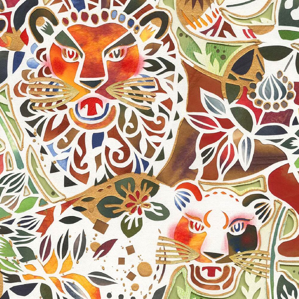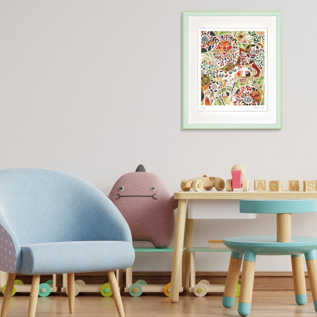 力強いライオンの存在感と華やかな花々の対比は、リビングや書斎などに飾ると特別なアクセントとなります。鮮烈な色彩が空間を引き締め、日常に躍動感を与えてくれる点が魅力です。ナチュラルなインテリアにも、モダンな雰囲気の部屋にもよく調和し、観るたびに新しい印象を与えてくれるでしょう。アートとインテリアが融合することで、空間そのものがギャラリーのような存在感をまとい、暮らしを豊かに彩ります。