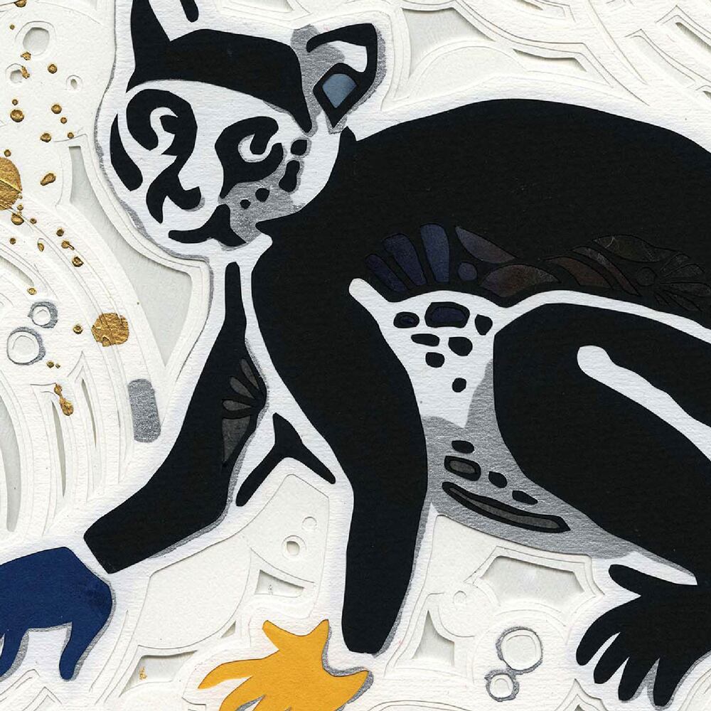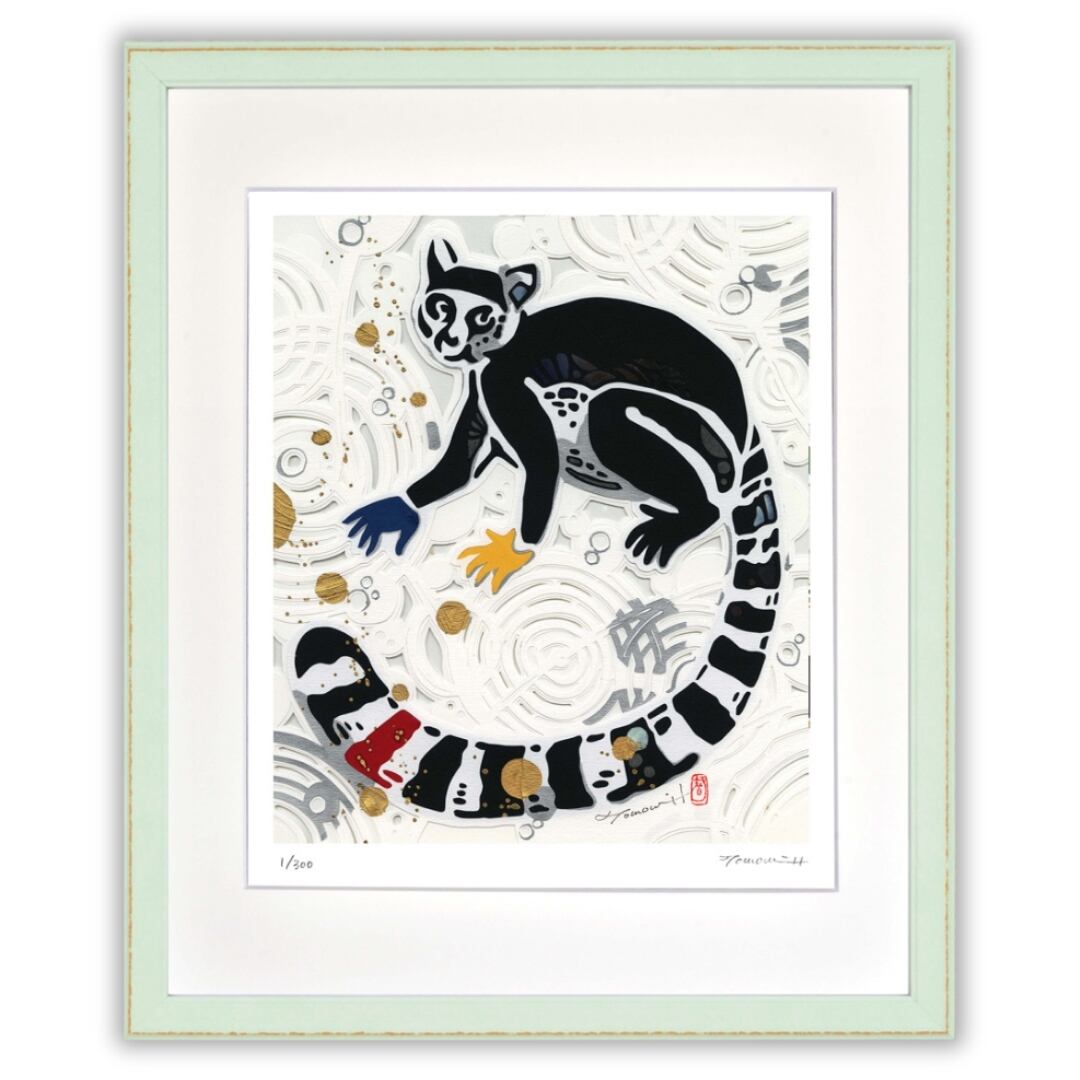 白と黒のコントラストが美しいワオキツネザルが、ユーモラスで愛らしい姿で描かれています。大きな瞳でじっと見つめる表情は存在感を放ち、長く縞模様の尾が画面全体にリズムを与えています。背景に施された円形の模様は、抽象的でありながら自然の循環や生命の息吹を連想させ、動物の魅力を一層引き立てています。さらに、手足に配された青や黄色、赤の鮮やかな色彩がアクセントとなり、シンプルな色合いの中に遊び心を添える効果をもたらしています。大胆でありながら愛嬌を感じさせる表現が、このアートの大きな特徴です。