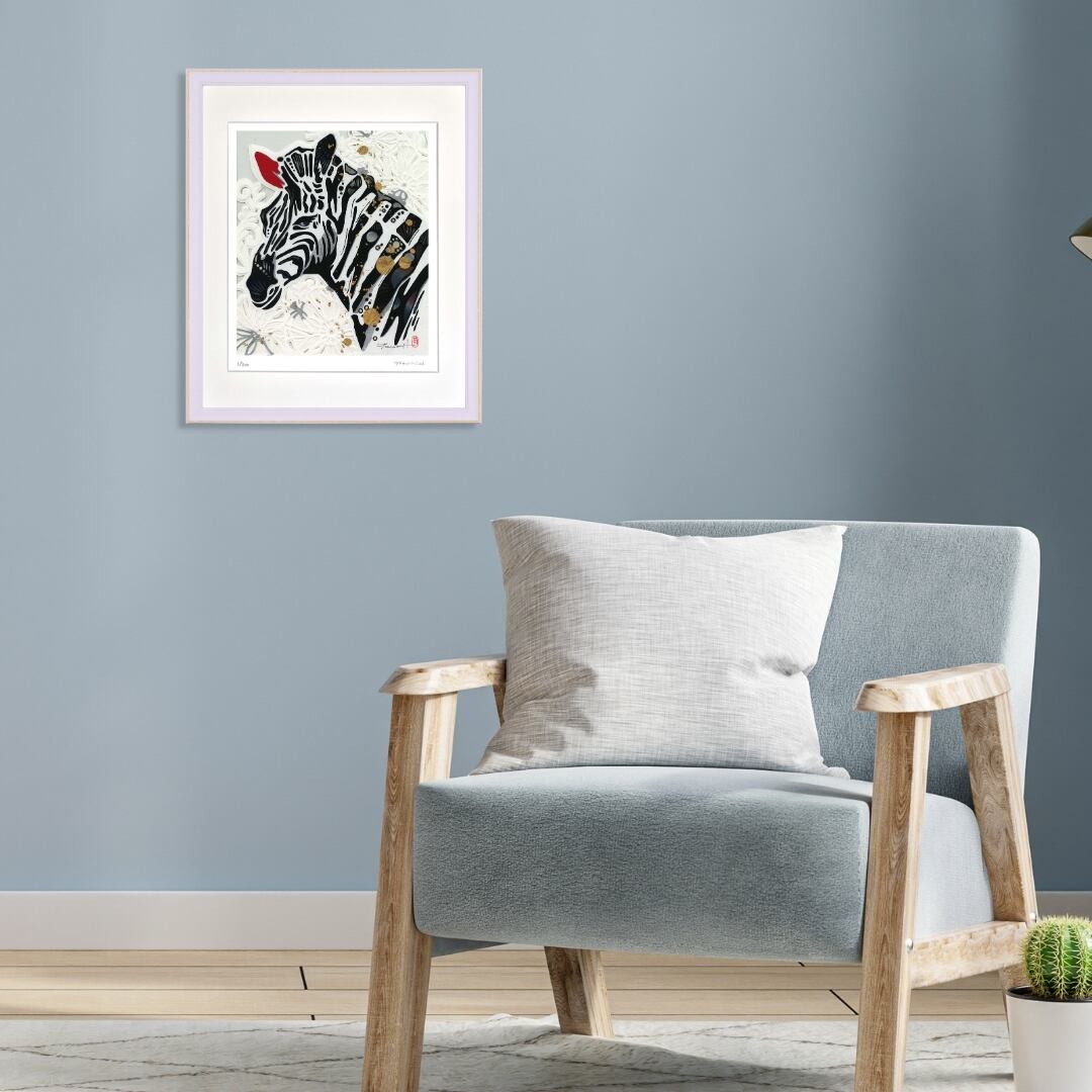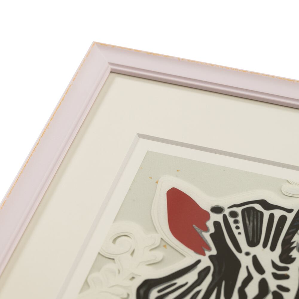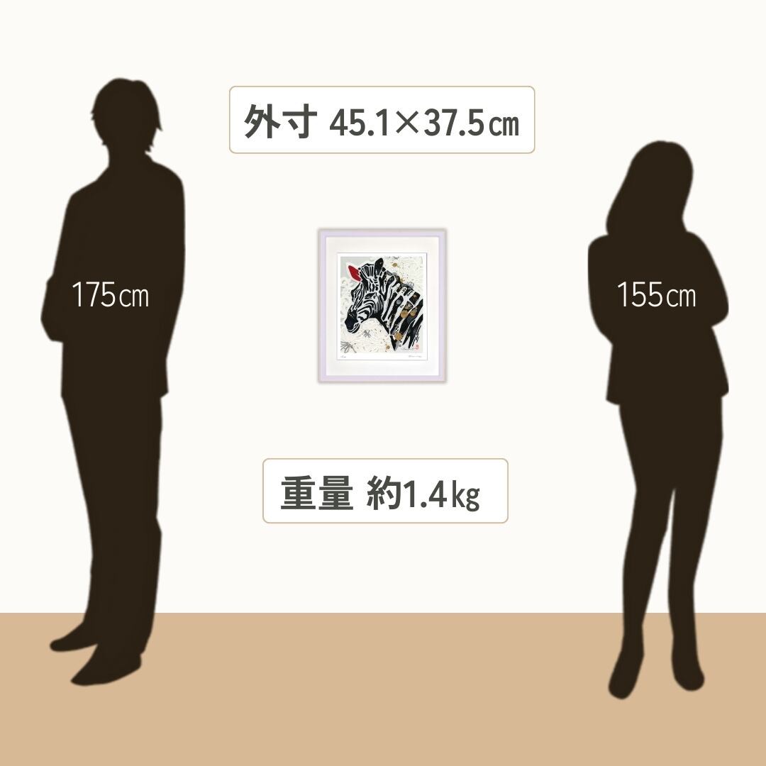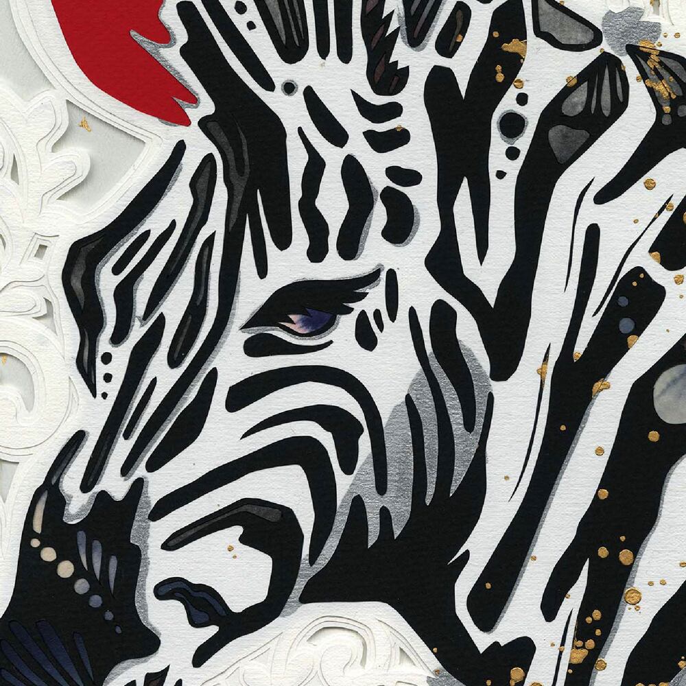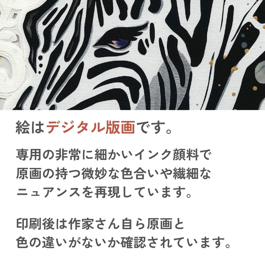 力強くも気品を漂わせるシマウマが、鮮やかな黒と白のコントラストで描かれています。特徴的な縞模様がリズムを生み、画面全体に美しい動きを与えているのが印象的です。耳の内側に配された鮮烈な赤がアクセントとなり、モノトーンの世界に躍動感を添えています。背景には繊細な花模様が施され、動物の野性味と優美さが見事に調和しています。金の煌めきが散りばめられていることで、画面に奥行きと輝きが加わり、観る人に洗練された印象を与えます。写実と装飾のバランスが絶妙で、動物の力強さをアートとして昇華させた一枚です。