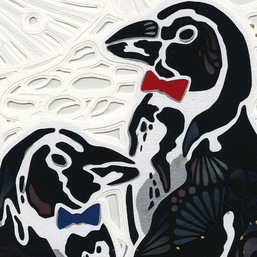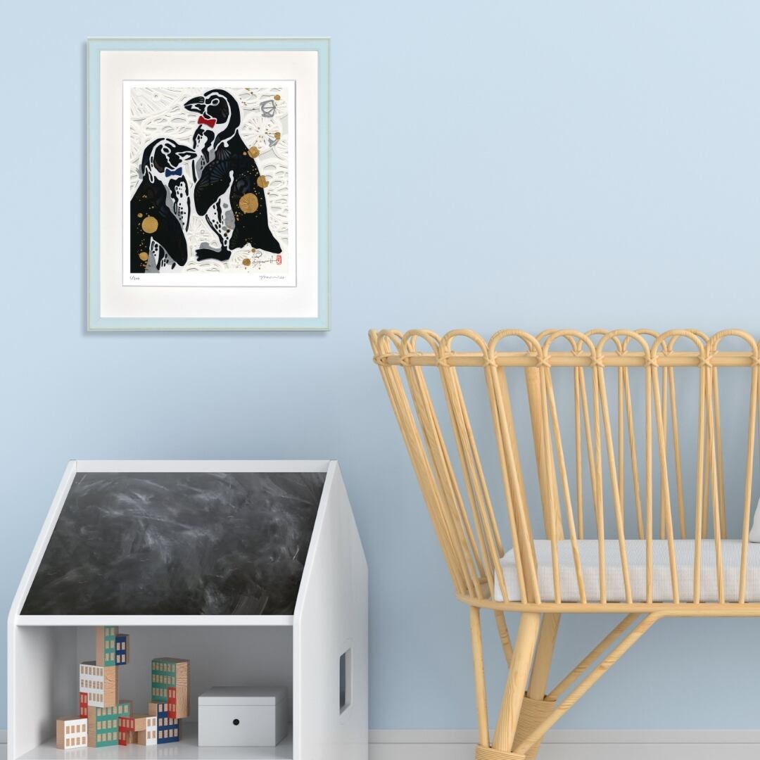 二羽のペンギンが寄り添う姿が愛らしく描かれた一枚です。黒と白のコントラストが鮮明で、シンプルな色合いながらも凛とした存在感を放っています。胸元にあしらわれた赤と青の蝶ネクタイが遊び心を添え、ペンギンたちに特別な個性を与えているのが印象的です。背景には繊細なレース模様のような装飾が広がり、金色のアクセントが夜空に瞬く星のように輝きを散らしています。静けさと華やかさが共存する構図は、見る人に温かさと上品な印象を同時に伝えてくれます。