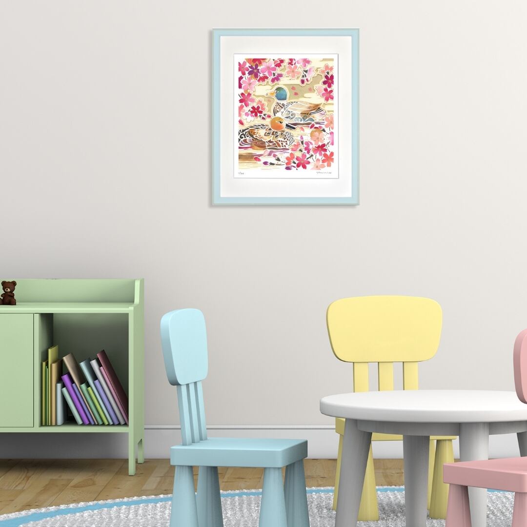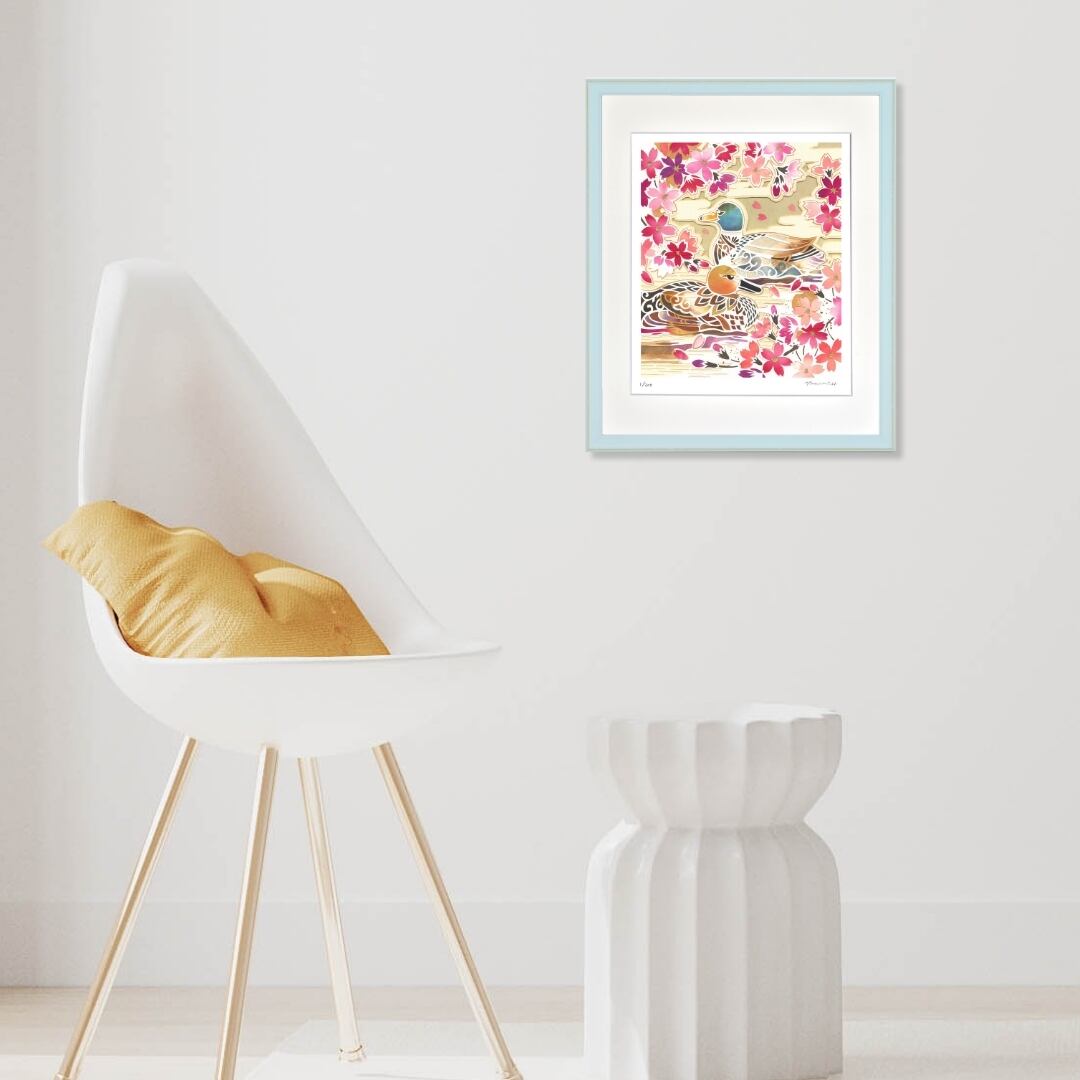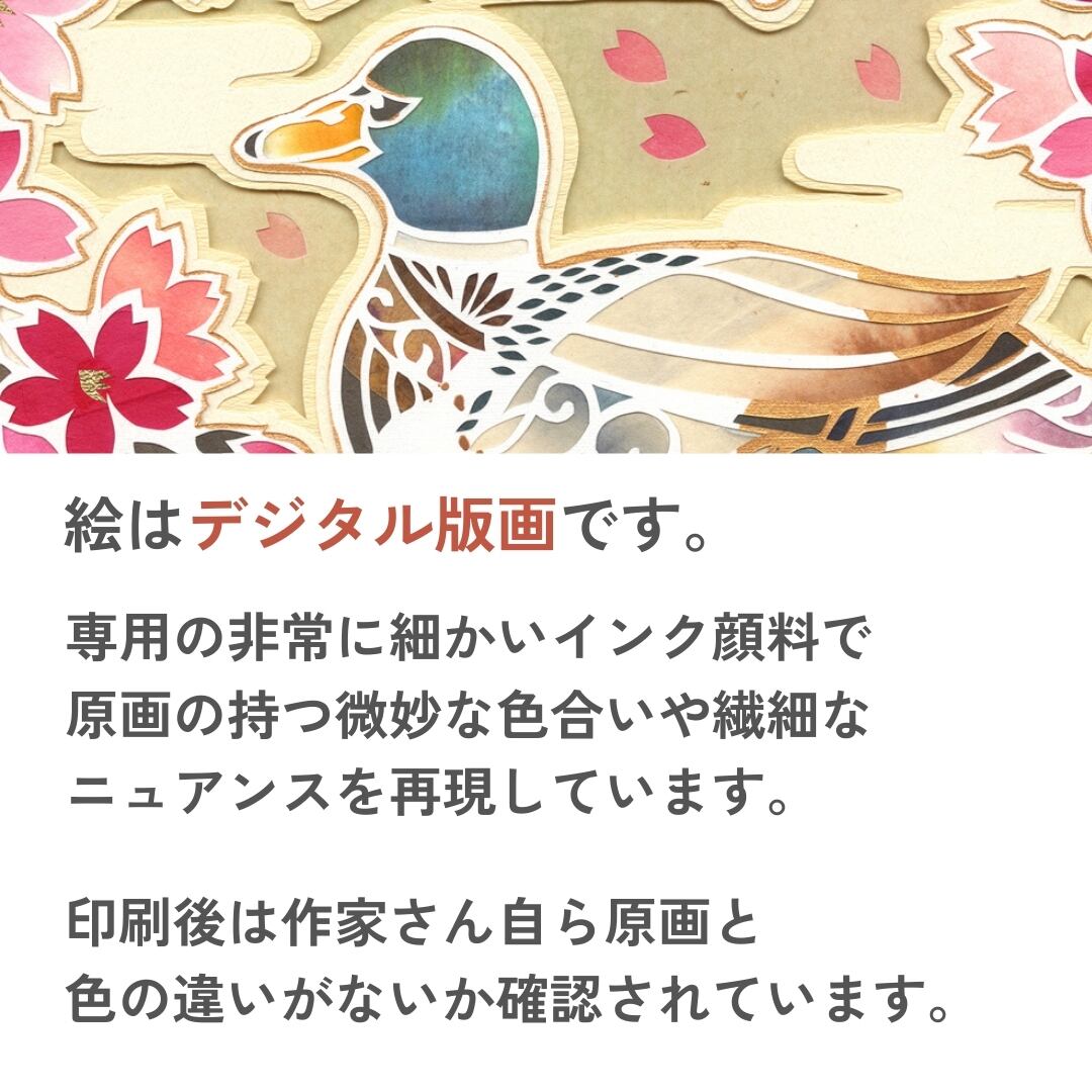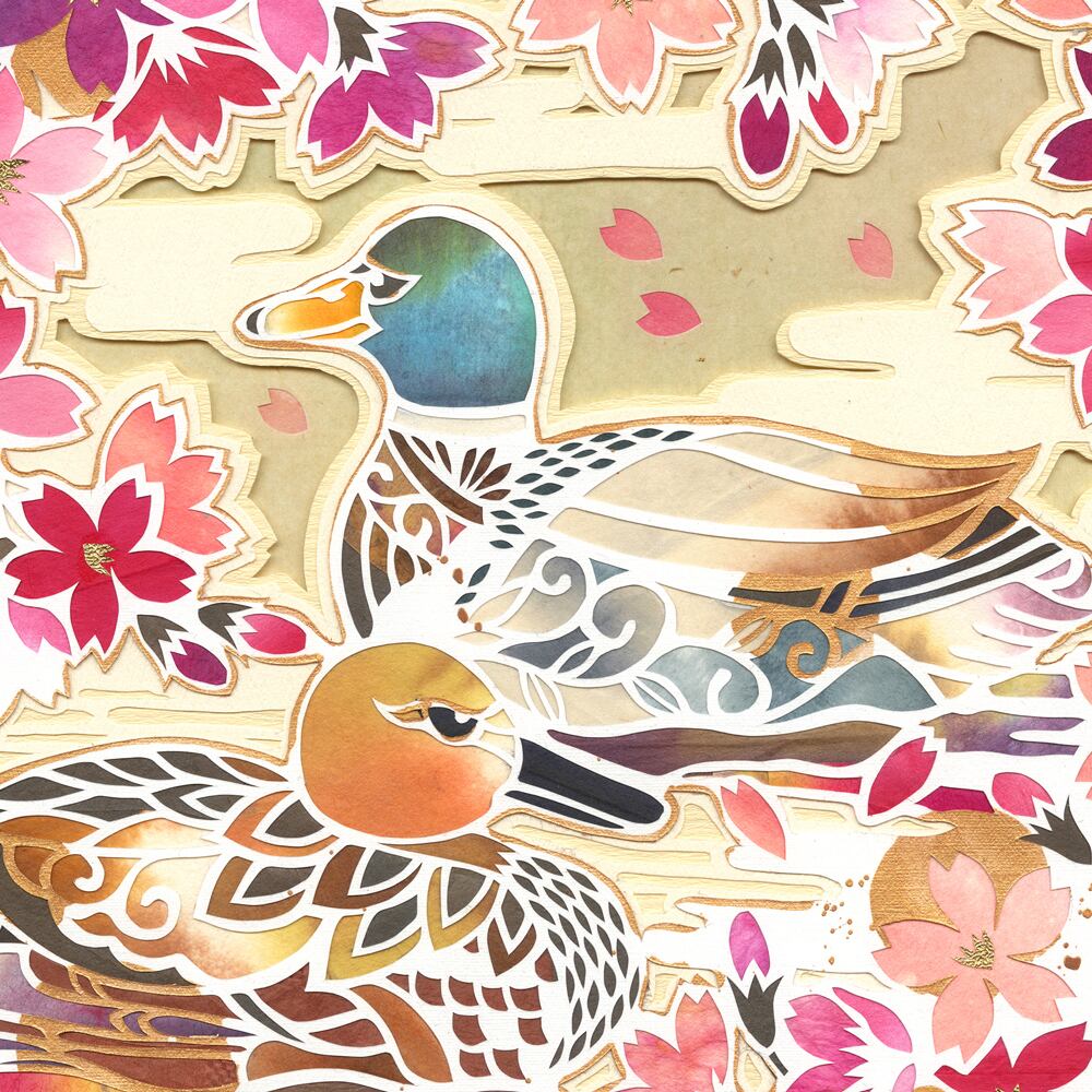 鮮やかな桜の花に包まれながら、二羽のカモが穏やかに水面を漂う姿が描かれています。優雅な羽の模様は繊細な線で表現され、自然の美しさと生命の調和を感じさせてくれます。ピンクから紅まで広がる桜の色彩は華やかでありながらも柔らかく、流れる水の金色の背景が全体を上品にまとめています。見るほどに心が和み、四季の移ろいとともに生きる生き物たちの姿に深い安らぎを覚える一枚です。