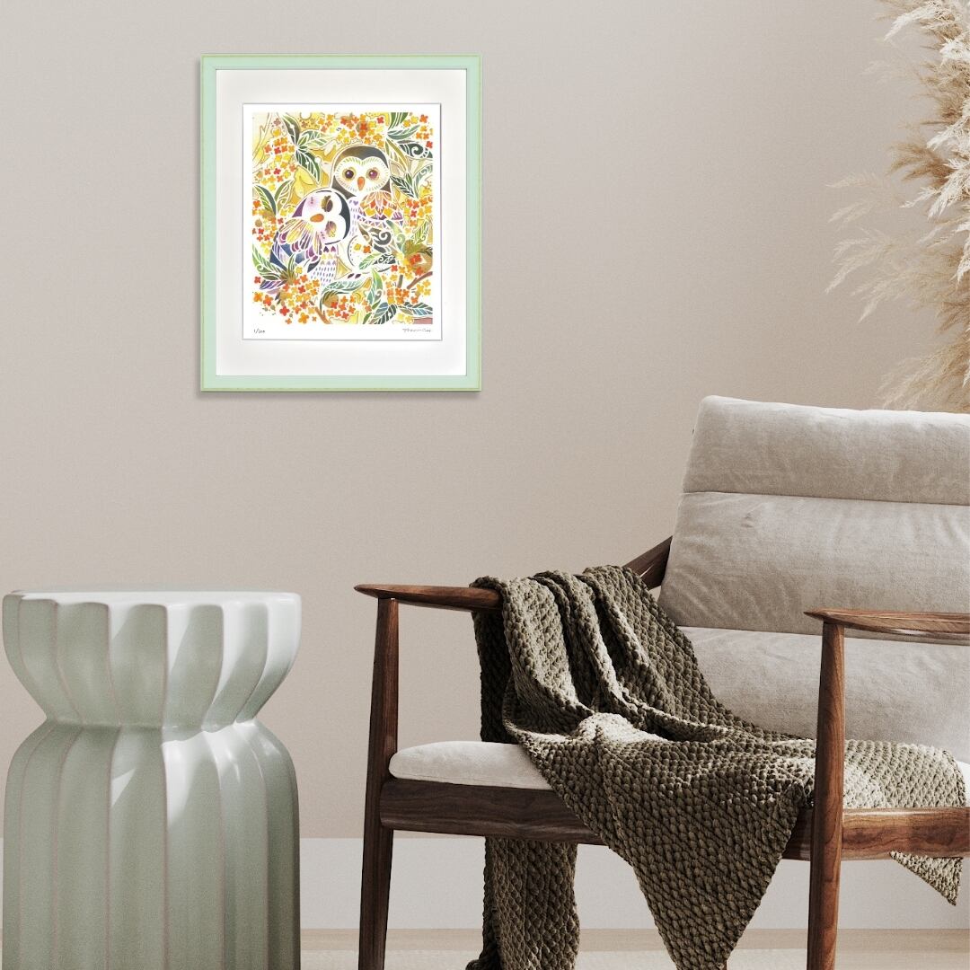 鮮やかな金木犀の花々に囲まれて寄り添う二羽のフクロウが、温もりと安心感を漂わせています。金木犀の橙や黄色の彩りは秋の豊かさを感じさせ、そこに静かに佇むフクロウたちの姿はまるで家族の絆を象徴しているかのようです。大きな瞳でこちらを見つめるフクロウと、目を閉じて安らぐフクロウの対比が、穏やかなひとときと心の安堵を表現しています。自然の恵みと生き物の調和が美しく調べられた一枚です。