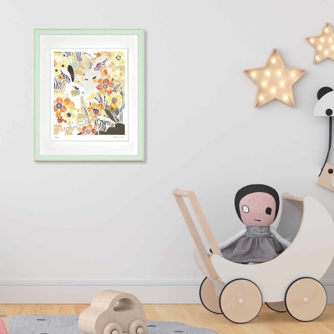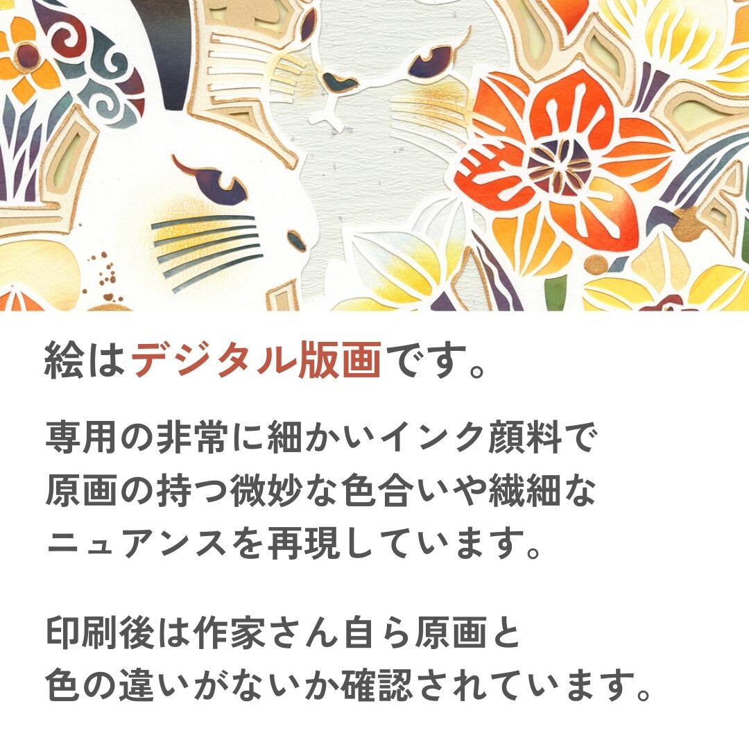 柔らかな色合いの中に描かれた二羽のうさぎが、花々に囲まれて静かに寄り添う姿が印象的です。白や橙の水仙が織りなす華やかな彩りが、背景を優しく照らし出し、清らかさと温もりを感じさせます。うさぎの表情には穏やかさと少しの凛々しさが宿り、花々の繊細な模様と調和して、物語性を感じさせる一枚です。鮮やかさと落ち着きのバランスが絶妙で、眺めるほどに心を和ませてくれます。