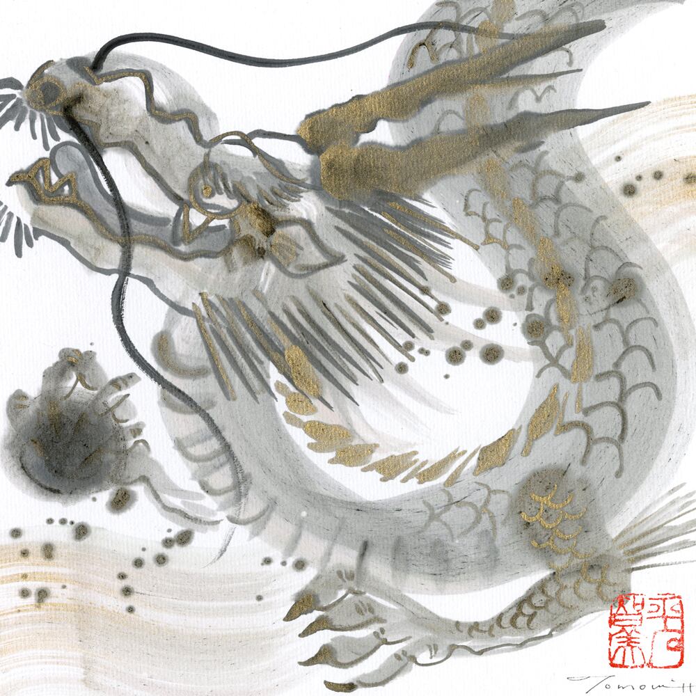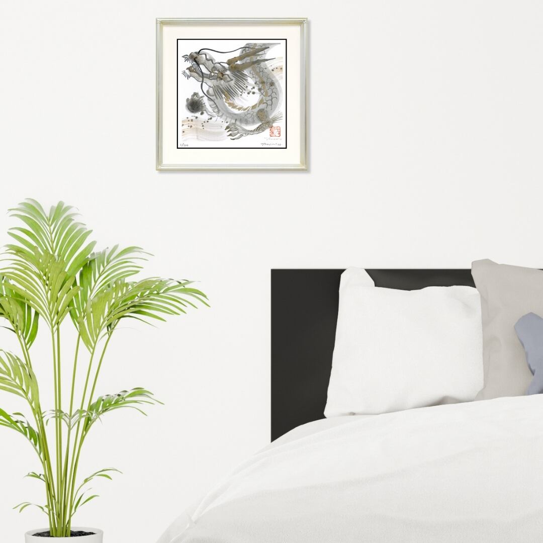 墨の濃淡で描かれた龍が、雲間を抜けるように悠々と進む姿が印象的です。白を基調とした背景に灰色と金色のアクセントが施され、柔らかな動きの中に力強さが宿っています。細やかに描き込まれた鱗や髭の表現は、繊細さと躍動感を同時に感じさせ、鑑賞する人の心を惹きつけます。抽象的な余白が龍の進む道を象徴するかのように広がり、静寂の中に神秘的な存在感を浮かび上がらせています。淡い色彩と墨の表現が織りなすこのアートは、幻想的でありながら凛とした美しさを持ち、眺めるたびに新たな発見を与えてくれるでしょう。