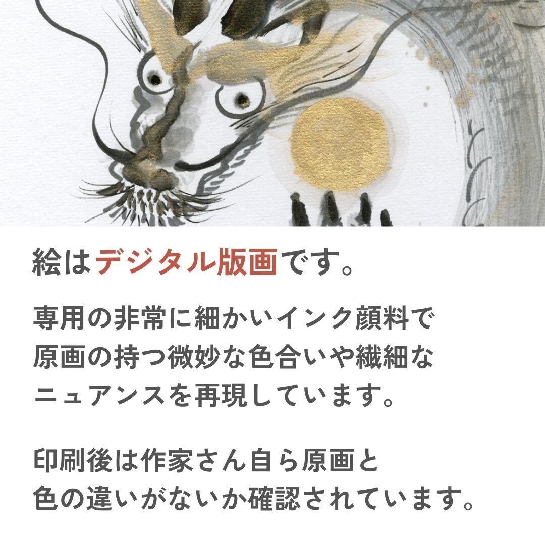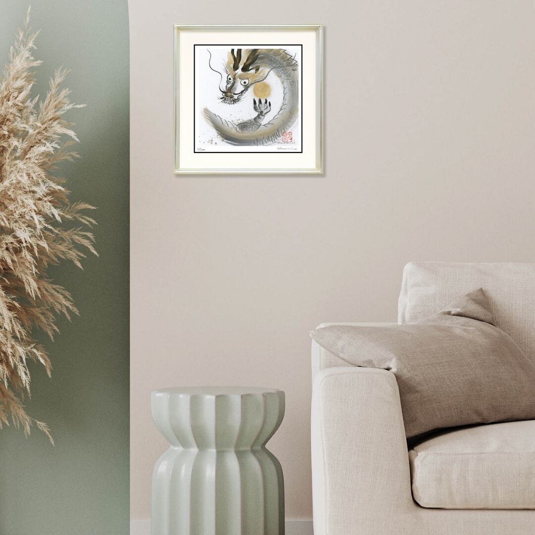 墨の力強いタッチと金色の輝きが調和したイラストは、空間に重厚感と洗練をもたらすインテリアアートです。龍が象徴する力や守護のイメージが込められており、飾ることで場の雰囲気を引き締めながらも華やかさを演出します。額縁付き仕様のため手にした瞬間からそのまま飾ることができ、住まいやオフィスに上質な存在感を添えます。墨絵ならではの奥行きと金彩の煌めきが、モダンなインテリアとも自然に調和し、和洋問わず幅広い空間で引き立ちます。伝統的でありながら現代的な魅力を備えたアートとして、長く愛される一枚となるでしょう。