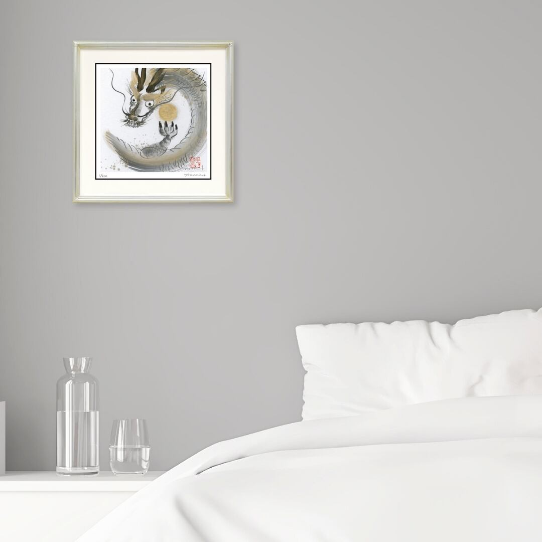 大きく見開いた瞳が印象的な龍が、金色の玉をしっかりと抱え込む姿は強烈な存在感を放っています。墨の勢いある筆致と金彩の輝きが対比を生み、まるで画面から飛び出してくるような迫力が感じられます。鋭い爪や力強い曲線が織りなす造形は、ただの神話的存在を超えて、生命力と神秘性を併せ持つ存在として描き出されています。背景の余白は龍の動きを一層引き立て、空間全体に緊張感と静けさを漂わせます。墨と金が織り成すこのアートは、幻想的でありながらも現実感を持ち、見る者に深い印象を与える作品です。