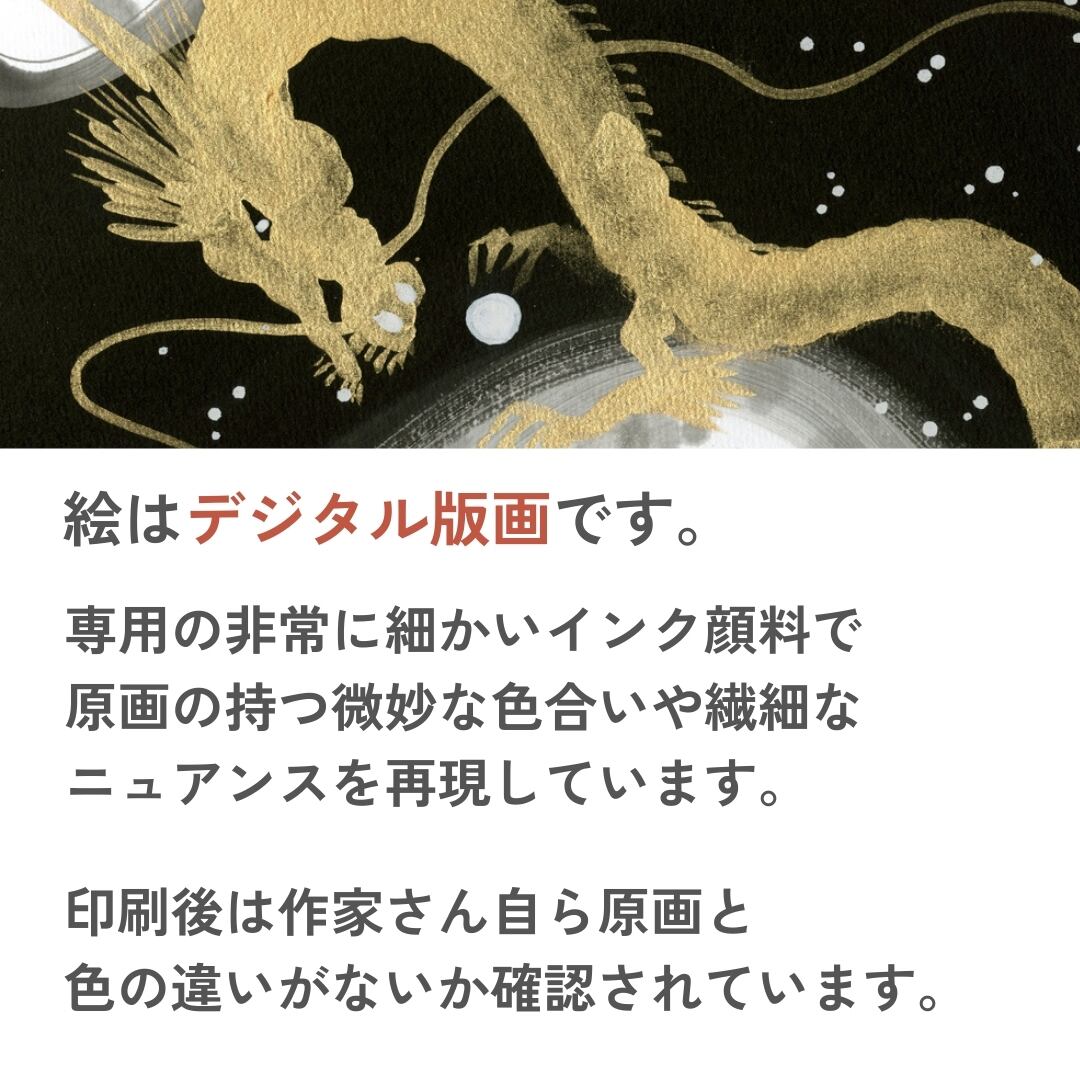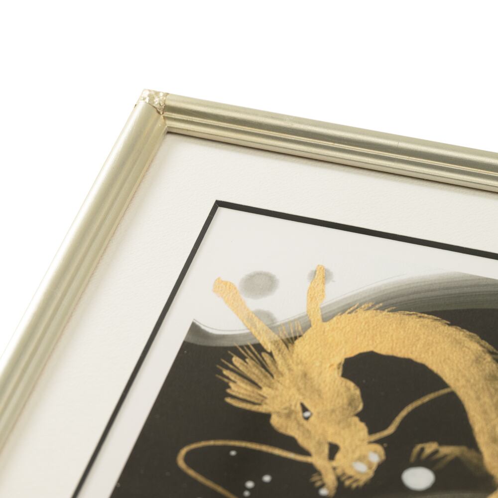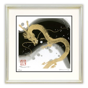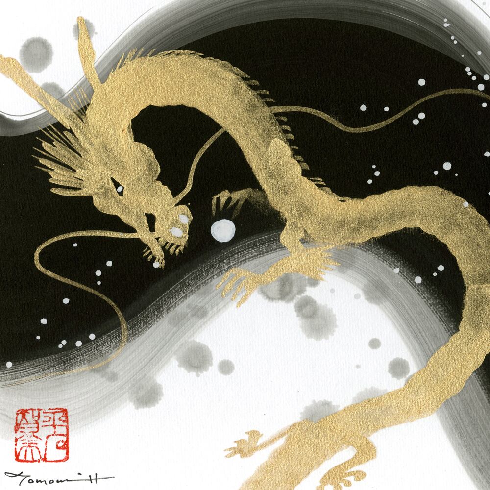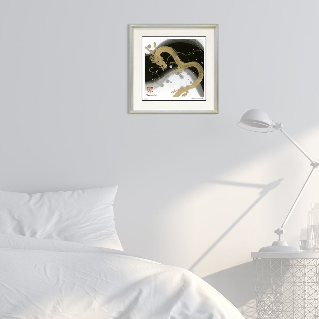漆黒の空間に金色の龍が舞う姿は、壮大な宇宙を切り取ったような神秘的な雰囲気を漂わせています。墨の濃淡が奥行きを与え、白と黒のコントラストが幻想的な舞台を形作り、その中で龍の体はしなやかに伸び、力強さと優美さを同時に感じさせます。龍が手にした珠は、未来や可能性を象徴するかのように光を放ち、画面全体に緊張感と輝きを与えています。筆致のリズムと金彩の煌めきが見事に融合し、観る人を深遠な物語へと誘います。このインテリアアートは、力強さと神秘性を兼ね備えた存在感ある作品として印象に残るでしょう。