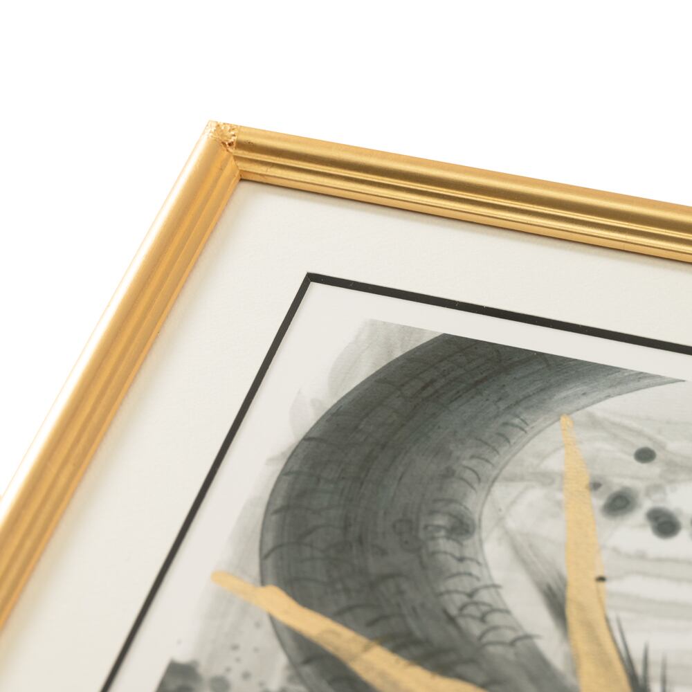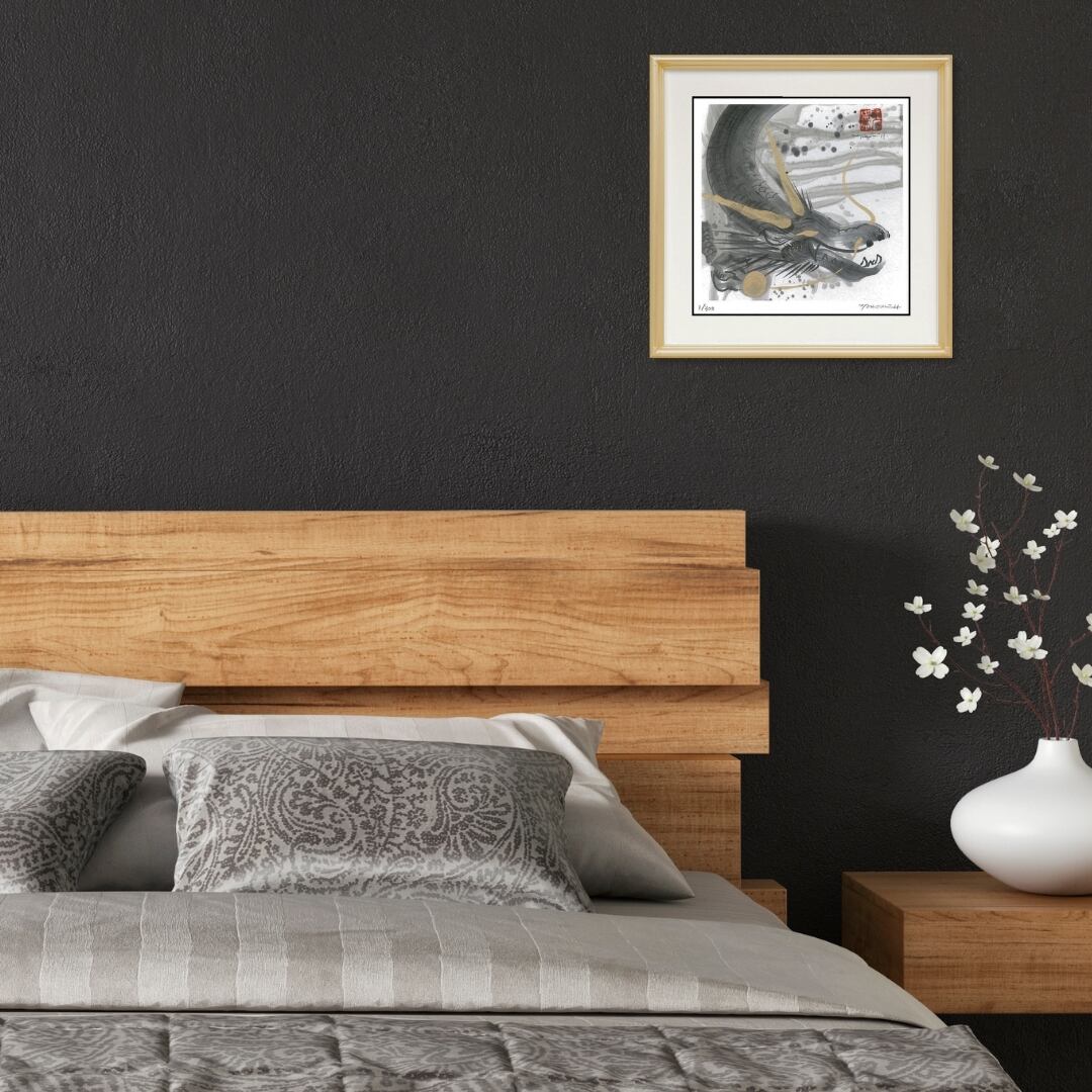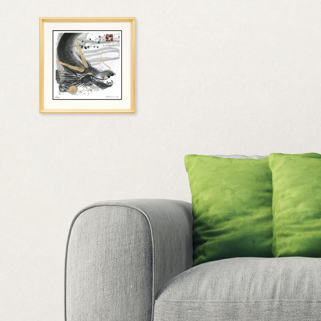 墨の濃淡で力強く描かれた龍の顔が画面いっぱいに迫り、圧倒的な存在感を放っています。金彩で施された角やひげが闇の中に光を与え、龍の威厳と神秘性を一層際立たせています。背景に流れるような線や水墨のにじみが、龍の動きや気迫を表現し、まるで大地を揺るがす瞬間を切り取ったような迫真の迫力を感じさせます。鋭い眼差しと口元の表情からは、未来を切り開く強い意志が伝わり、観る者に深い印象を与えます。伝統的な題材を現代的な筆致で描いたこのインテリアアートは、力強さと美しさを併せ持つ作品といえるでしょう。