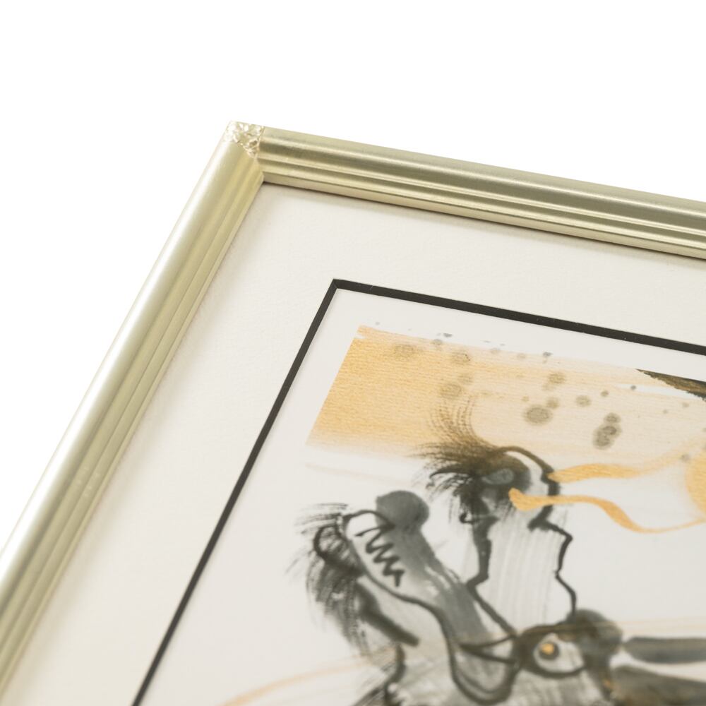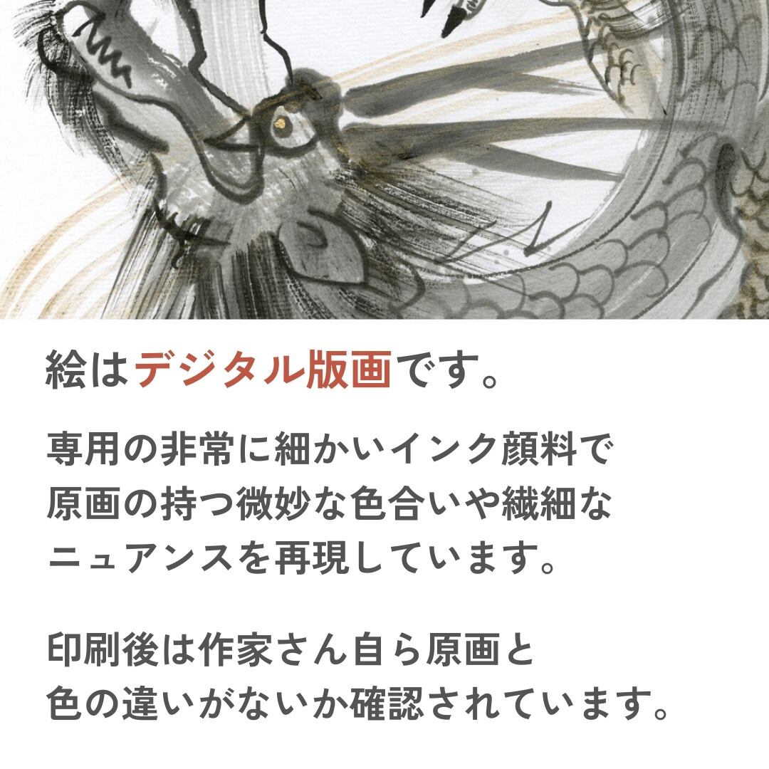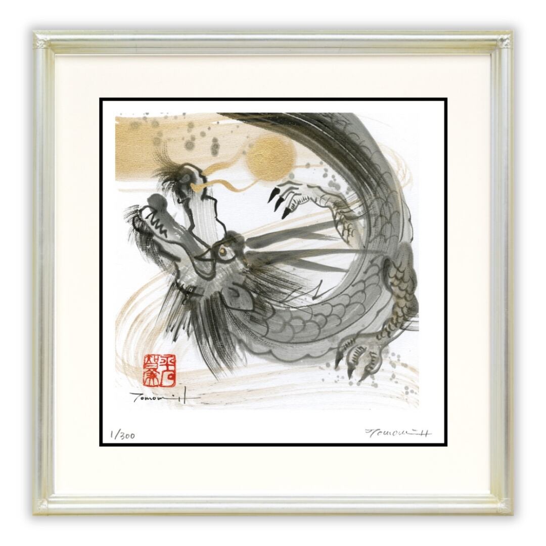 墨の力強いタッチと繊細な筆運びで描かれた龍が、天空に舞い上がるような姿を見せています。鋭い眼差しと躍動感あふれる体のうねりからは、守護者としての強靭な力と威厳が伝わってきます。背景には淡い金色の光が添えられ、龍が天と地をつなぐ神聖な存在であることを象徴しているようです。ひげや鱗の細やかな表現により、墨と金彩が調和した美しい陰影が生まれ、幻想的でありながら迫真のリアリティを感じさせます。鑑賞するほどに新たな表情を見せるこのインテリアアートは、空間に静かな緊張感と深いエネルギーを宿す作品といえるでしょう。