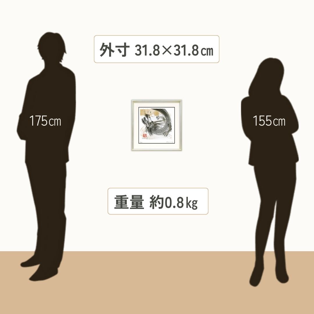 墨と金彩で描かれた龍のイラストは、空間に力強い存在感を与えるインテリアアートです。額縁付きでそのまま飾れる仕様になっており、リビングや書斎、玄関などに置くことで荘厳な雰囲気を演出します。龍は古来より守護と繁栄の象徴とされ、この作品からも確かな安定感と力強い気配を感じ取ることができます。墨の濃淡が生み出す奥行きと、金色の輝きが放つ神秘的な印象が調和し、和室だけでなく洋室のアクセントとしても映えるデザインです。日常の空間に特別な気を呼び込み、飾る人の心を励ますアート作品として長く楽しめるでしょう。