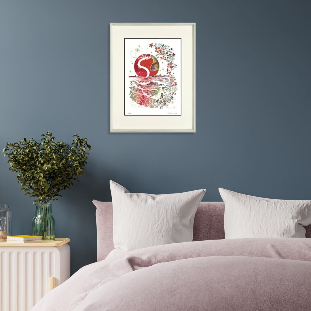 鮮やかな切り絵と美しい彩色を融合させたインテリアアートは、白い龍と日の出の光を表現し、力強さと清らかさを同時に感じさせます。額縁付きでそのまま飾れるため、リビングや玄関、オフィスなどさまざまな空間に気品を添えます。龍は古来より守護と繁栄を象徴し、日の出は新しい始まりや希望の象徴でもあり、季節の節目や新生活のお祝いにふさわしい作品です。切り絵ならではの繊細な模様や鮮やかな色彩は、光の当たり方で表情を変え、空間を華やかに演出します。開運や縁起物としても喜ばれるインテリアアートであり、贈り物としてもおすすめです。