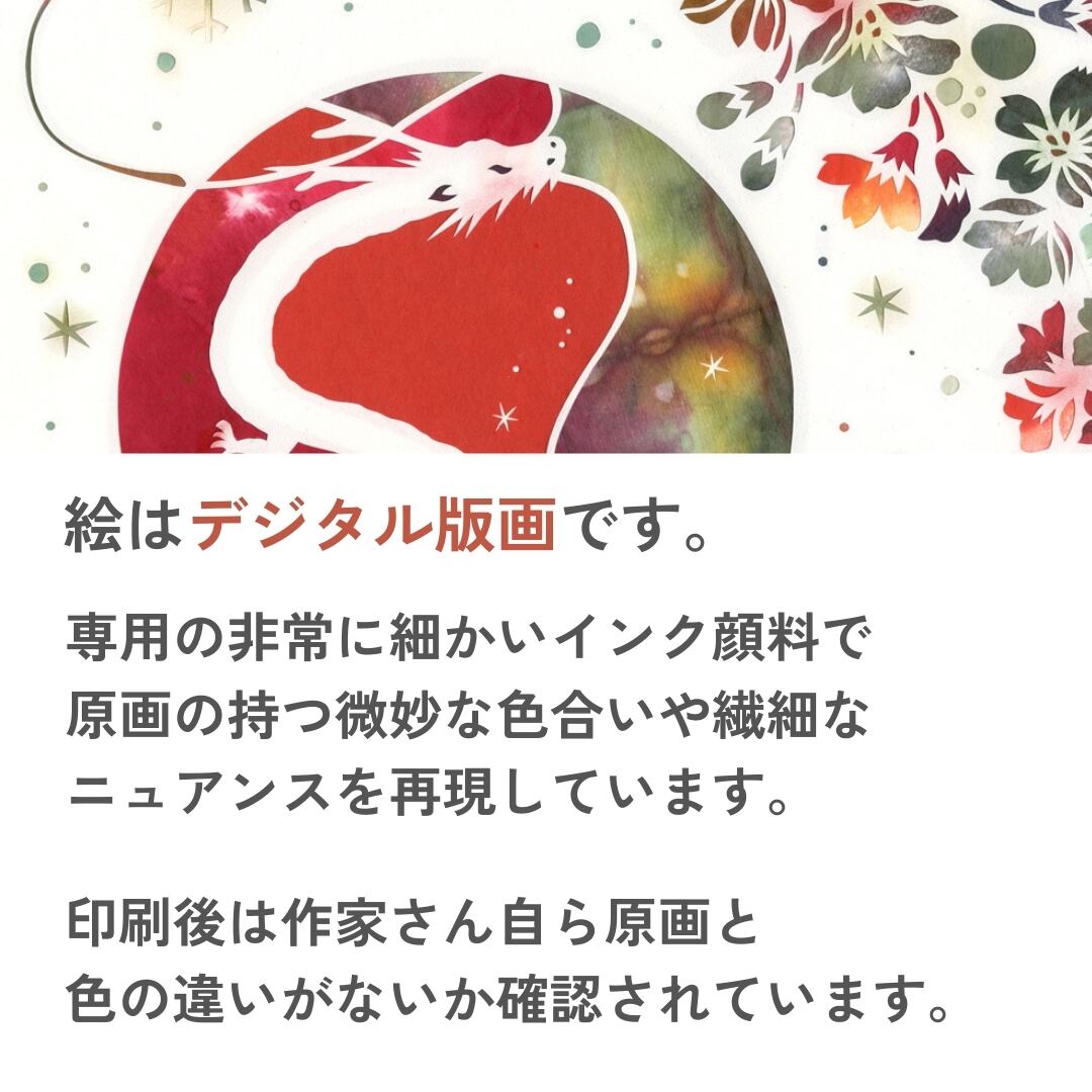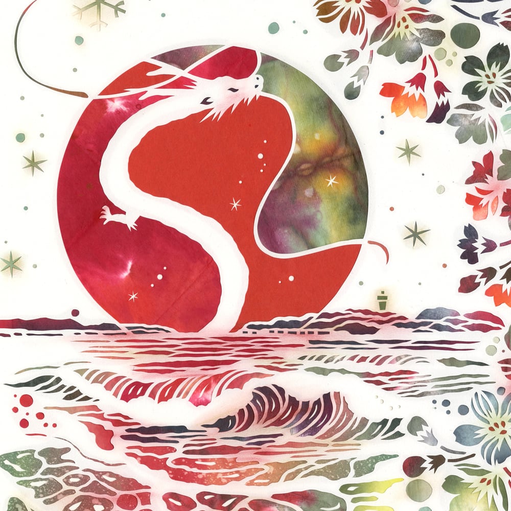 切り絵ならではの透け感と彩りが美しく、幻想的な世界を描き出しています。大きな円を背にした白い龍が、力強くも優雅に姿を見せ、日の出を思わせる赤と金の光に包まれています。周囲を舞う花々や星のようなきらめきが繊細に配置され、自然の恵みと生命の輝きが画面全体に広がっています。海面には揺らめく波と光の反射が表現され、春の訪れを感じさせる華やかな色合いが心を和ませます。切り絵の重なりと色彩の妙が織りなす作品は、観る人に清らかな始まりと希望を感じさせ、日々に新鮮なエネルギーを与えてくれるようです。