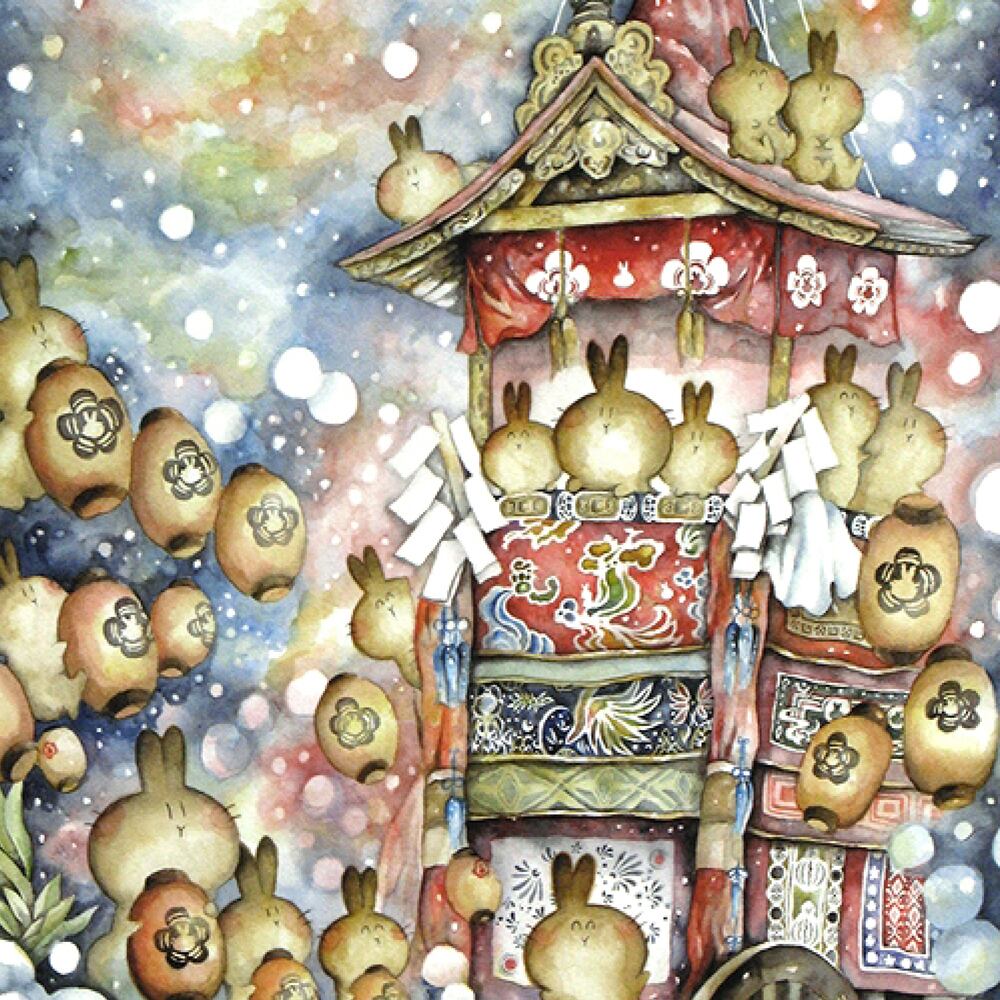 宵の空を染める灯の群れ。うさぎたちは、やわらかな鈴の音に導かれるように、絢爛な山車を押し進めます。