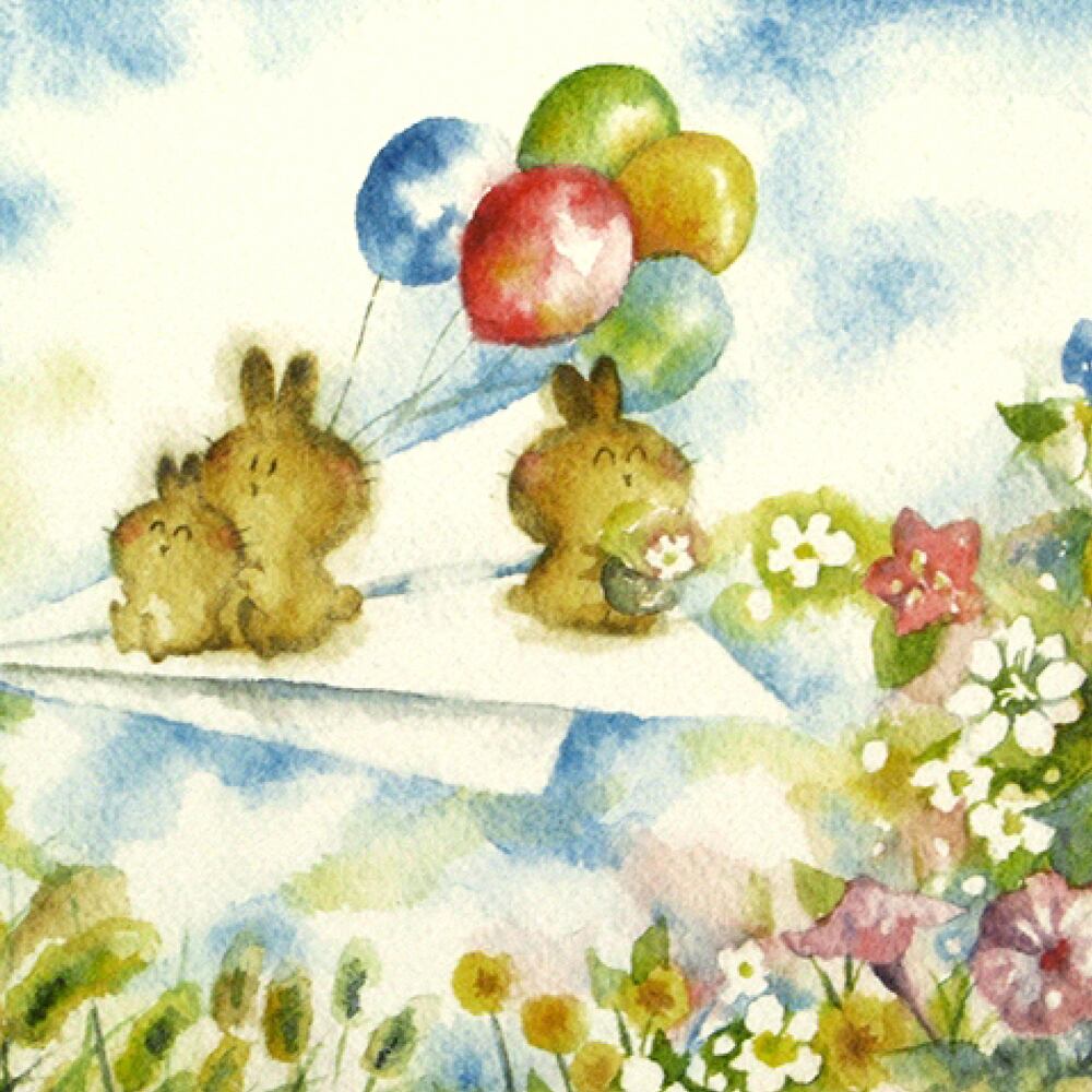 やわらかな風に揺れる花々の間を、うさぎたちを乗せた紙ひこうきがふわりと舞い上がります。