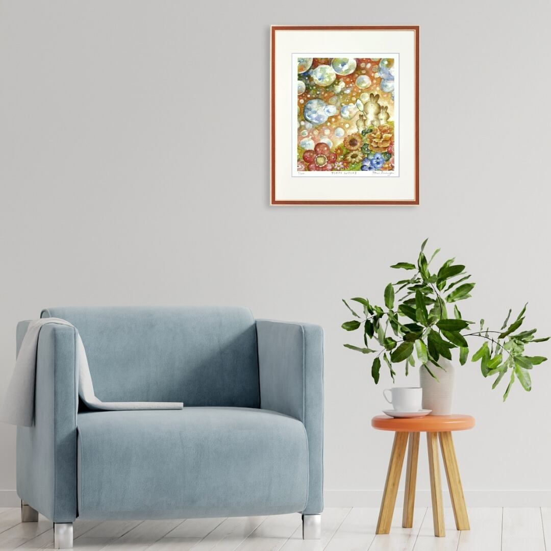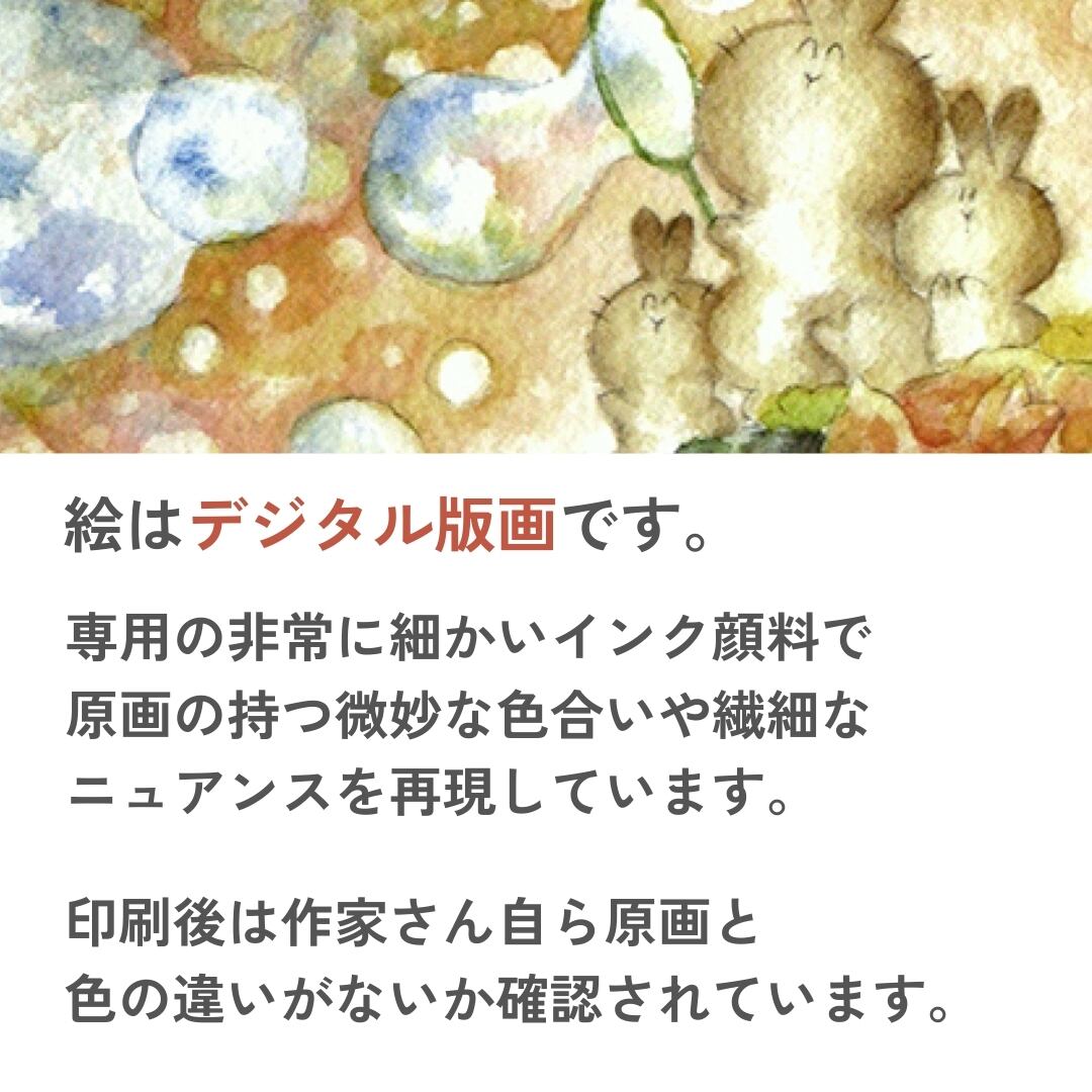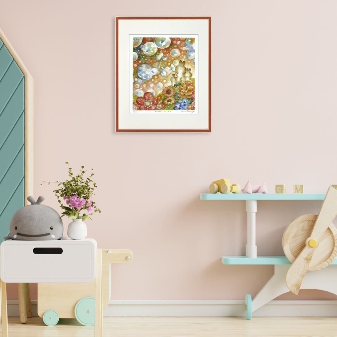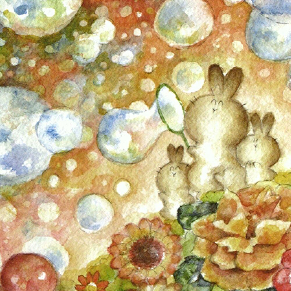 夕暮れの光がやさしく差し込み、空気全体があたたかな色に包まれています。花々のあいだからのぞくうさぎたちは、浮かんでは消えるしゃぼん玉を静かに見つめ、光の粒を目で追っています。淡くにじむ色彩と透明感のある光が、心に穏やかな余韻を残してくれます。まるで一日の終わりに訪れるやすらぎの時間を、そのまま絵の中に閉じ込めたような優しい情景です。