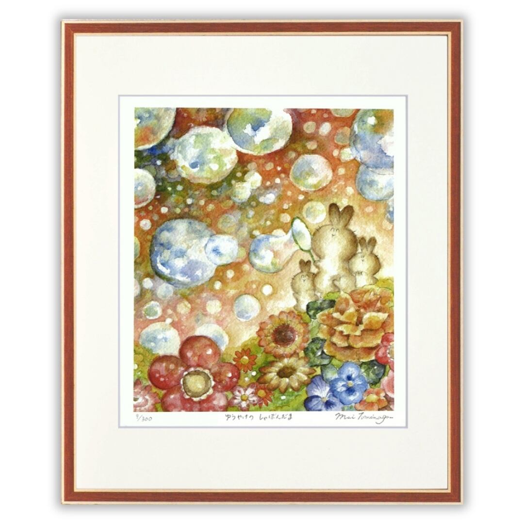 イラストレーター「とみながまい」が描く、透明水彩絵具によって表現された季節の風景と楽しげな動物たちが版画作品になりました。