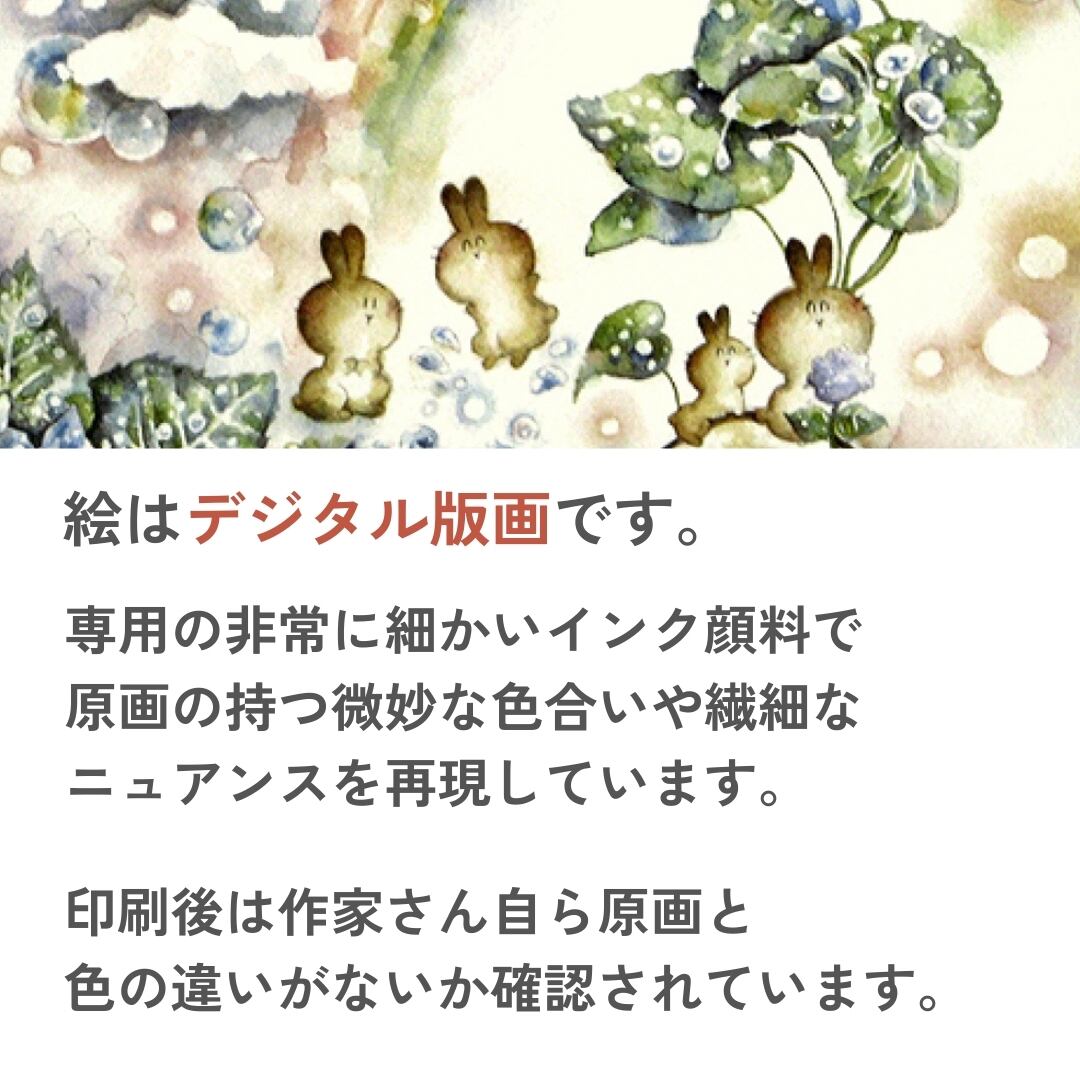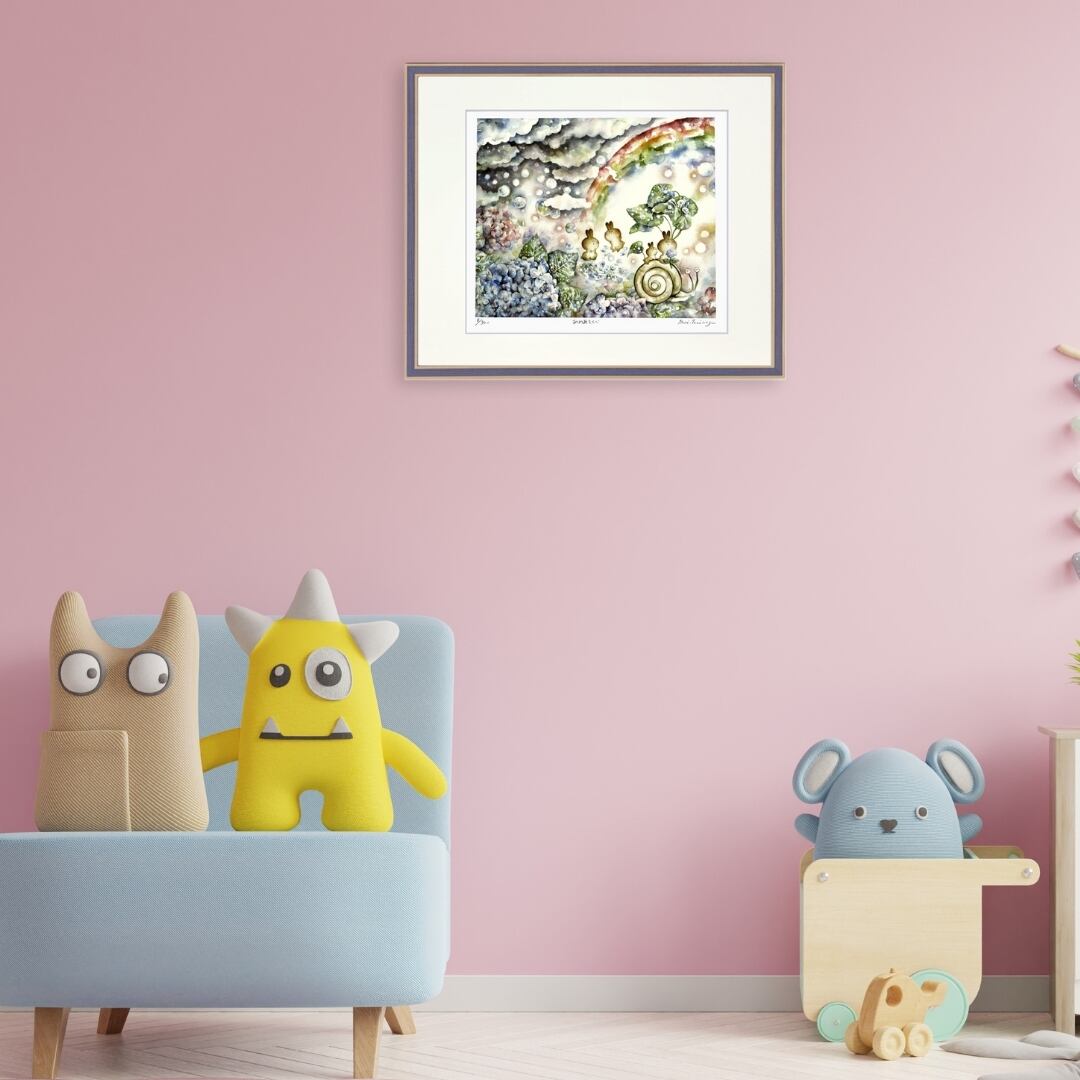柔らかな色彩で描かれたインテリアアートは、雨上がりの透明な空気を部屋に運んでくれるようです。リビングや寝室に飾ると、静かな時間の流れを感じさせ、心を穏やかに整えてくれます。虹の優しいグラデーションと、うさぎたちの愛らしい表情が空間にぬくもりを添え、自然と笑みがこぼれるような癒しの効果があります。季節の変わり目や雨の日に見ると、より一層その美しさが引き立ちます。忙しい日常の中に、小さな安らぎを与えてくれる一枚です。