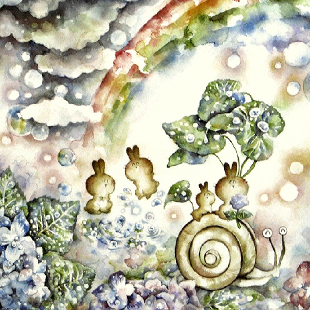 雨上がりの森に、虹の橋がかかる幻想的な光景。紫陽花の葉に乗ったうさぎたちや、やさしく見守るかたつむりの姿が、しっとりとした空気の中にあたたかな生命の息吹を感じさせます。雨粒のきらめきや淡い光の表現が美しく、静けさの中に希望の輝きが差し込むような一枚です。雨の日の憂鬱さを忘れさせてくれるような柔らかな色調と、うさぎたちの無邪気な表情が心を癒やします。眺めているだけで、ふと立ち止まり、自然の音や香りを感じたくなるような、詩的な世界観が広がっています。