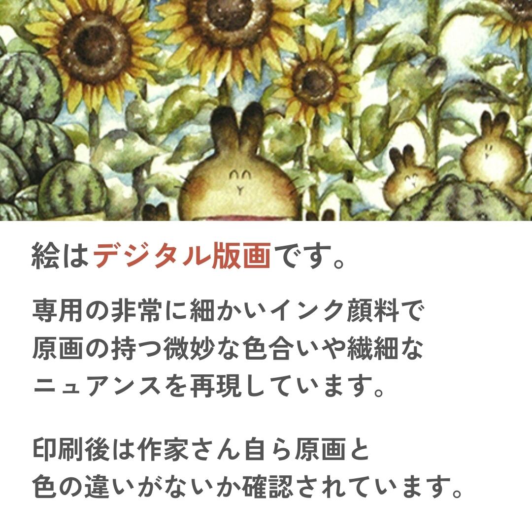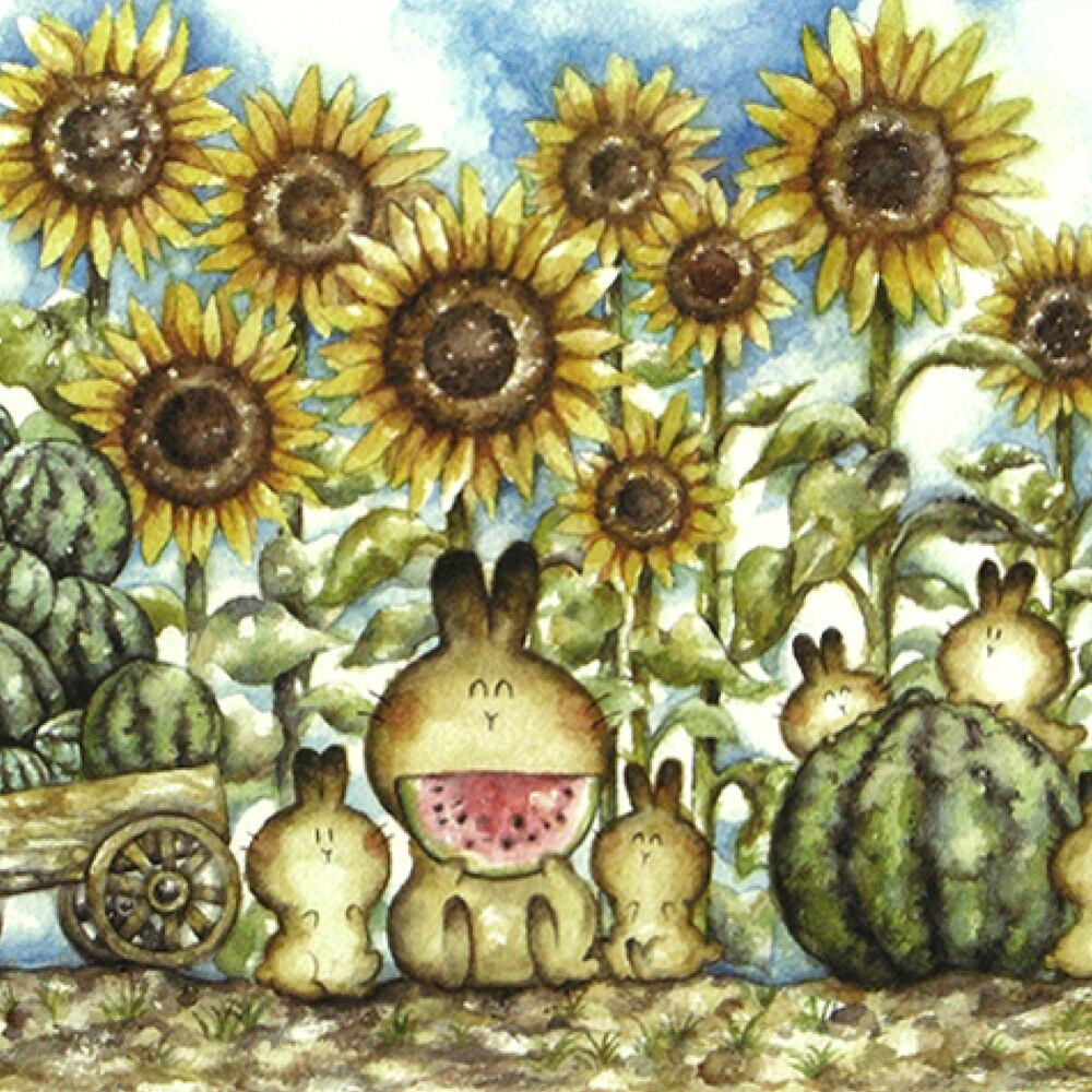 満開のひまわり畑の中、うさぎたちが夏の味覚・すいかを頬ばる微笑ましい光景が描かれています。太陽の光をいっぱいに浴びた花々と、赤くみずみずしいすいかの対比が、夏らしい生命力と爽快感を感じさせます。大きなすいかを囲んで笑顔を交わすうさぎたちの姿には、無邪気な喜びと仲間との温かなつながりがあふれています。青空の広がりと、土の香りまで伝わってくるようなリアルな筆致が魅力的で、見ているだけで元気が湧いてくる一枚です。夏の記憶の中にある幸せな時間を思い出させてくれます。
