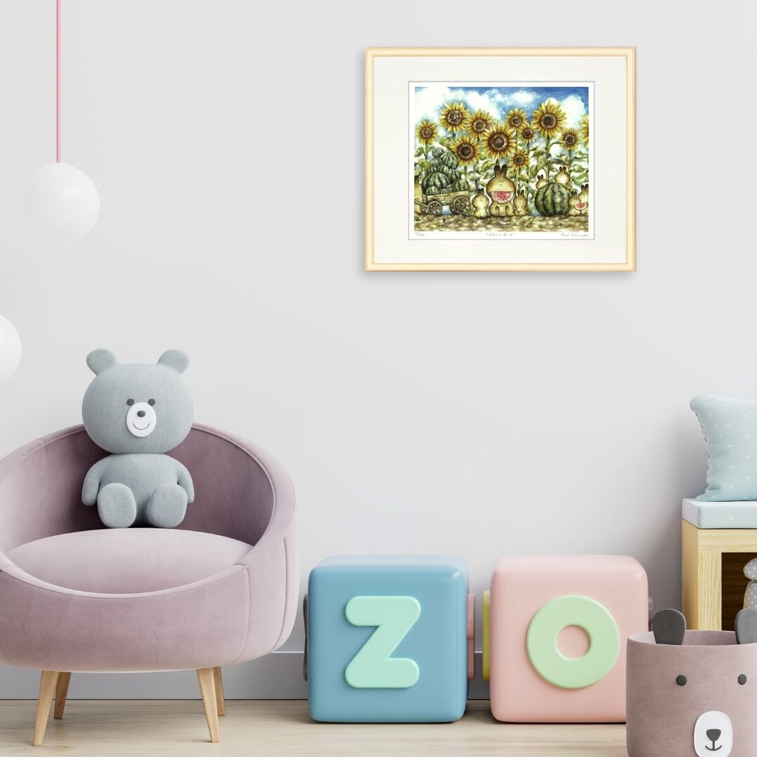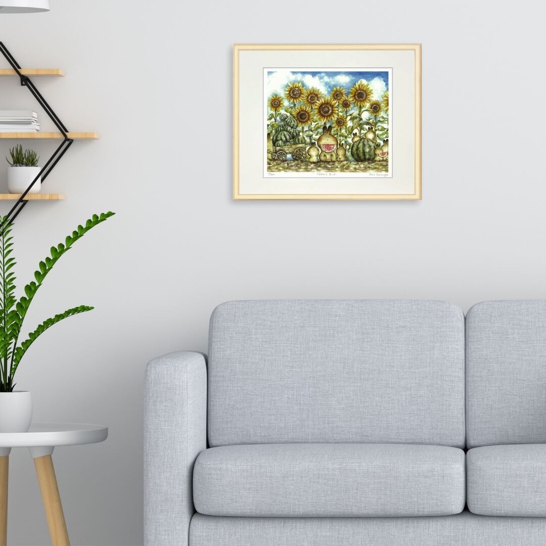 夏の明るさを描いたインテリアアートは、空間にエネルギーと開放感をもたらします。リビングやダイニングに飾ると、まるで太陽の光が部屋に差し込むような温かさを感じられます。ひまわりの鮮やかな黄色と青空のコントラストが、空間を明るくし、前向きな気分へと導いてくれるでしょう。うさぎたちの楽しげな表情は、見る人に自然な笑顔をもたらし、家族の集まる場所にぴったりです。ナチュラルな木製フレームとも好相性で、四季を問わず夏の陽気さを感じられる作品です。
