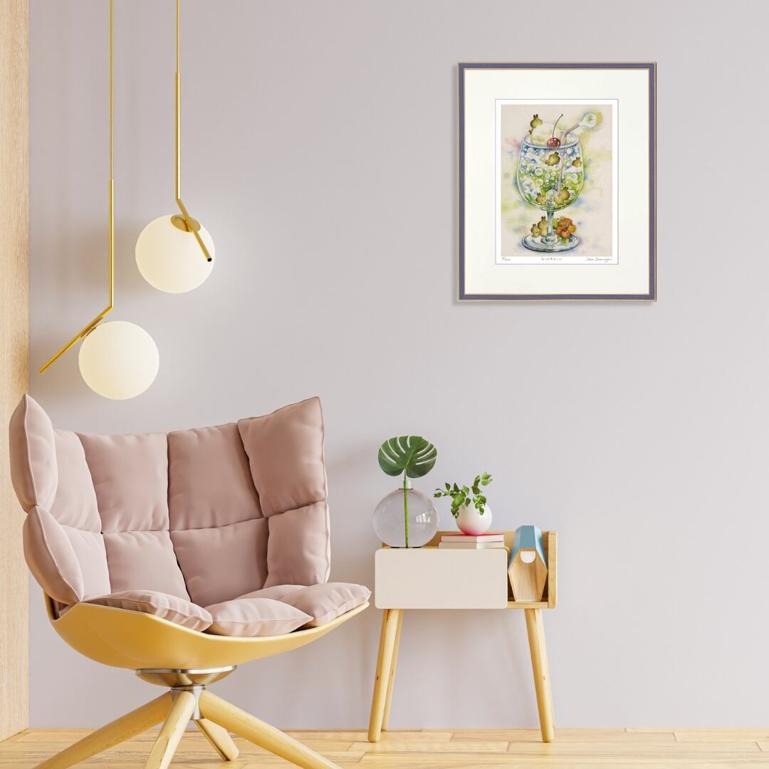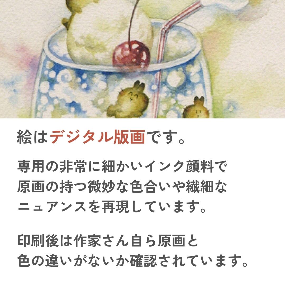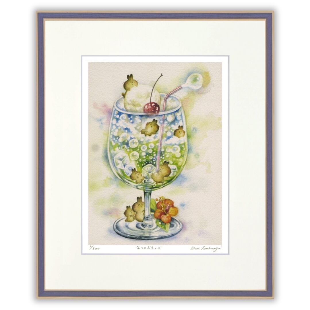 涼やかなクリームソーダのグラスの中に広がる、夢のような世界を描いた作品です。透き通るような緑のソーダの中を、うさぎたちがぷかぷかと泳いでおり、その表情には夏の日の楽しさと無邪気さがあふれています。氷の輝きや泡の透明感、チェリーやアイスクリームの色合いが絶妙で、見ているだけで心がひんやりと癒されます。絵全体に漂う優しい光は、子どもの頃に感じた夏の甘い記憶を思い起こさせ、どこか懐かしい幸福感に包まれます。