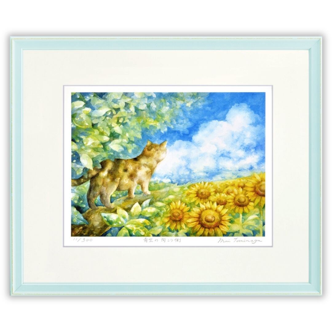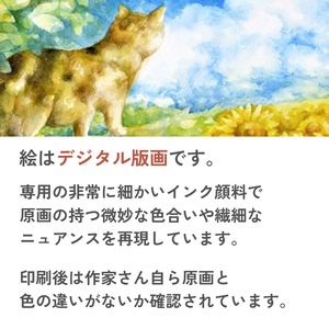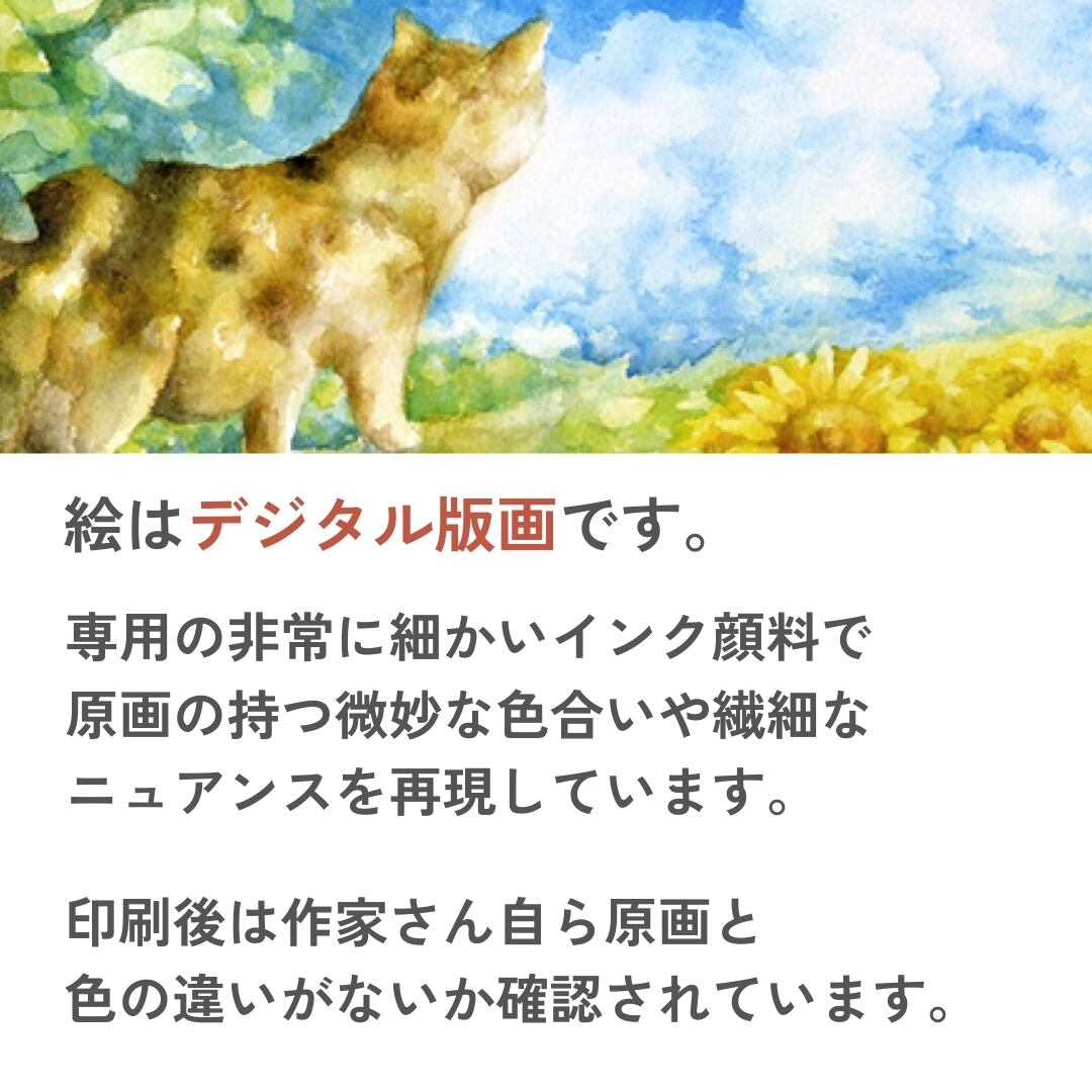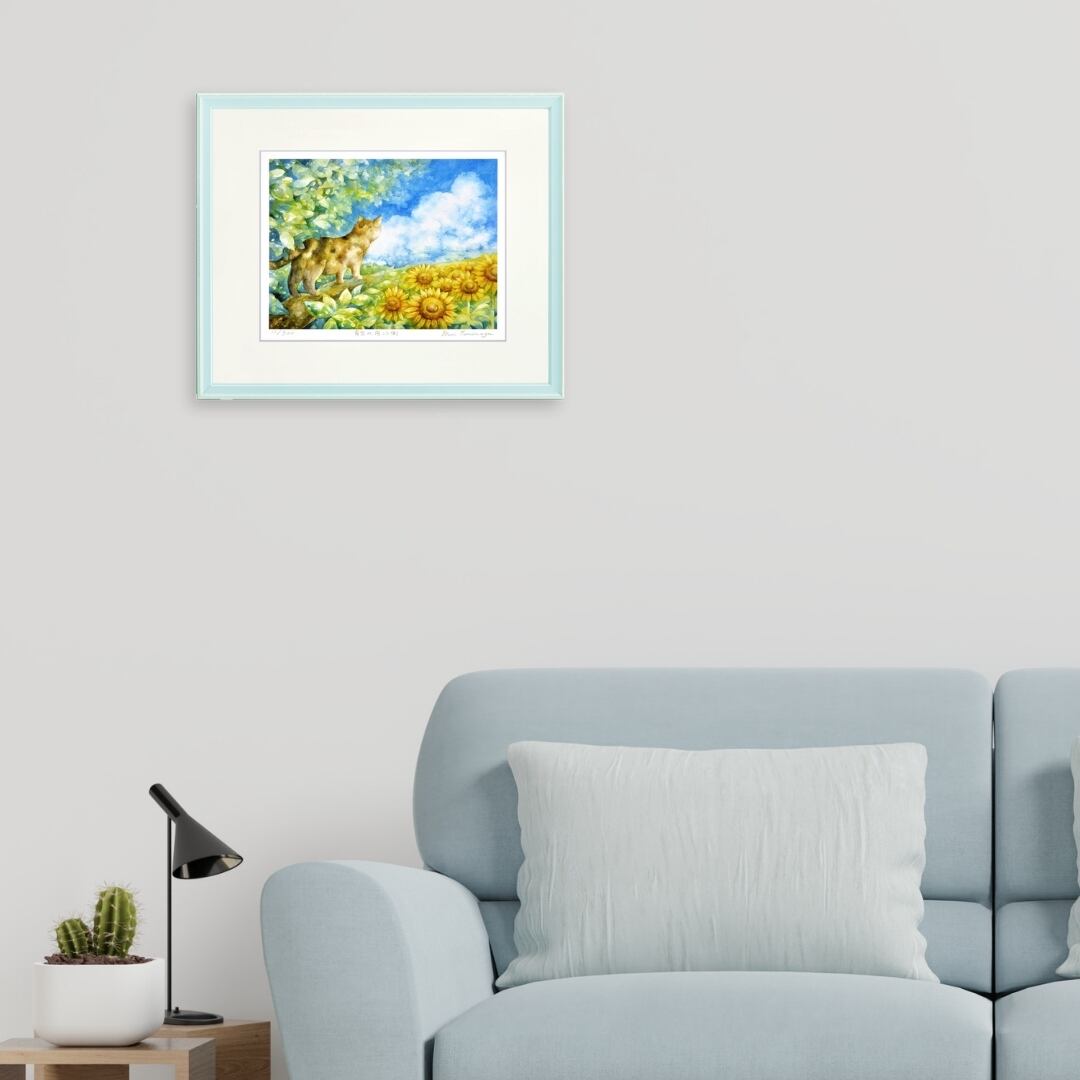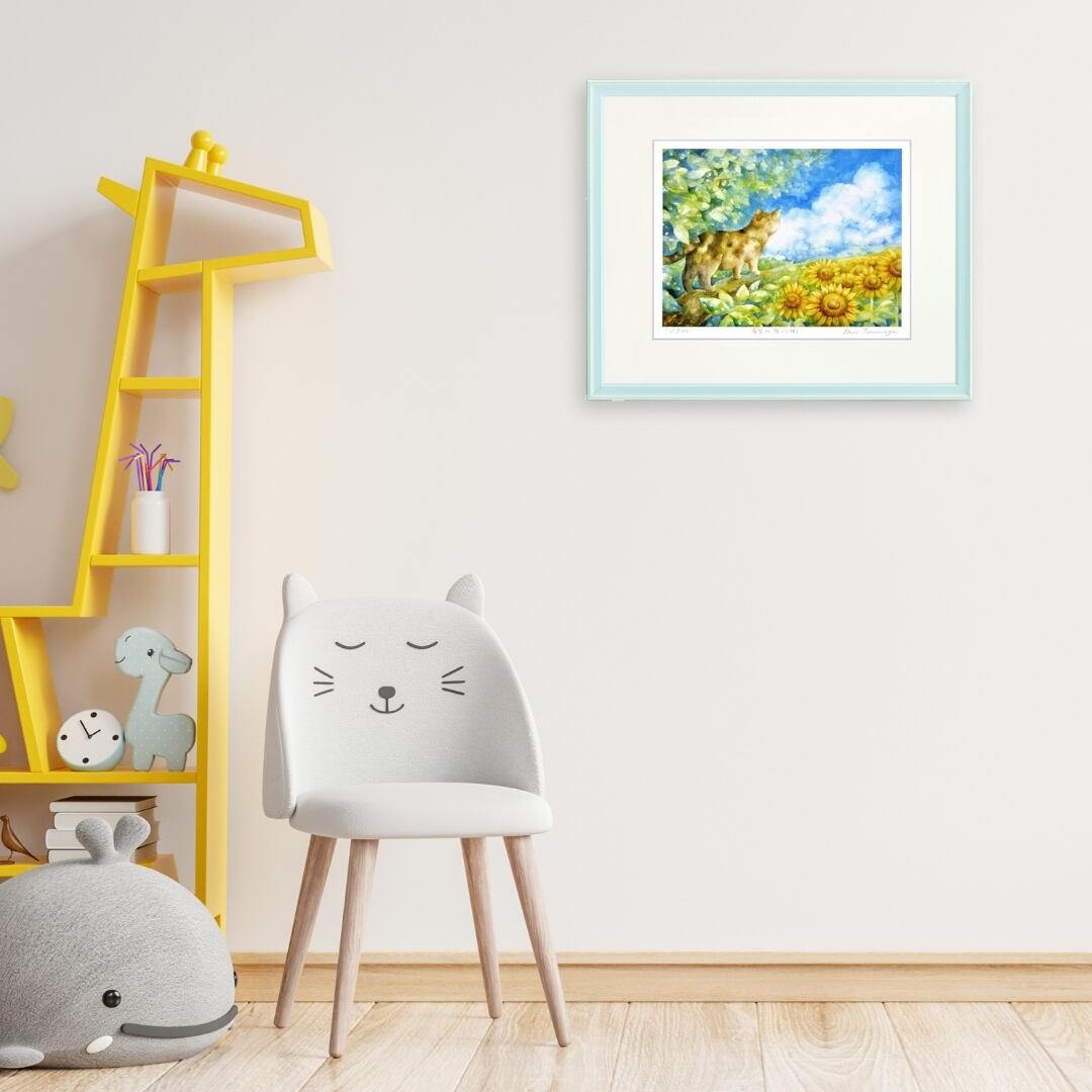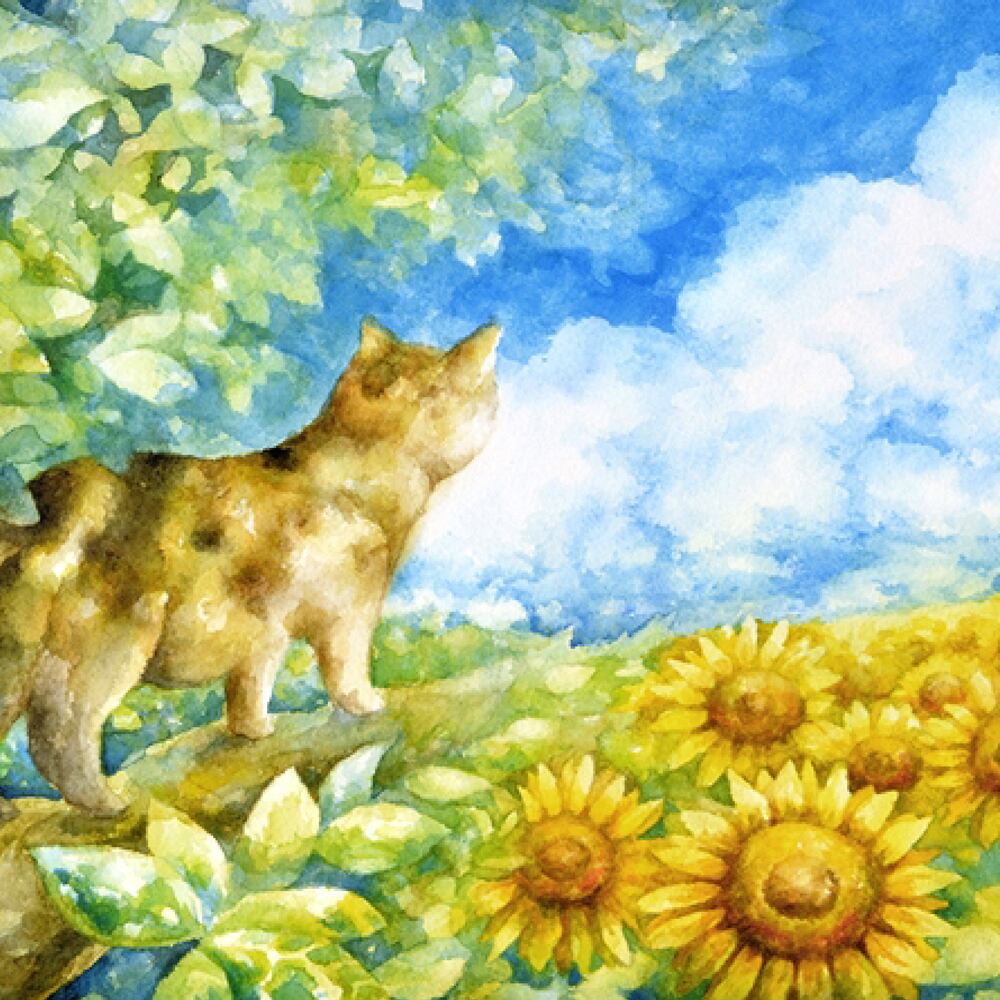 眩しいほどの青空と、太陽の光をいっぱいに浴びたひまわり畑が印象的な一枚です。柔らかな筆づかいで描かれた木漏れ日の中、猫が静かに遠くを見つめる姿は、未来への希望や自由を象徴しているように感じられます。空の青とひまわりの黄色が美しく調和し、爽やかな風が吹き抜けるような心地よさが広がります。穏やかな夏の午後の空気や、光のぬくもりが丁寧に表現されており、見る人の心を晴れやかにしてくれる作品です。