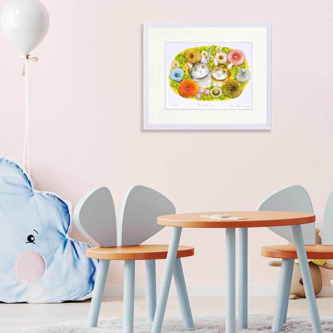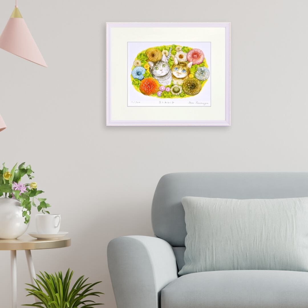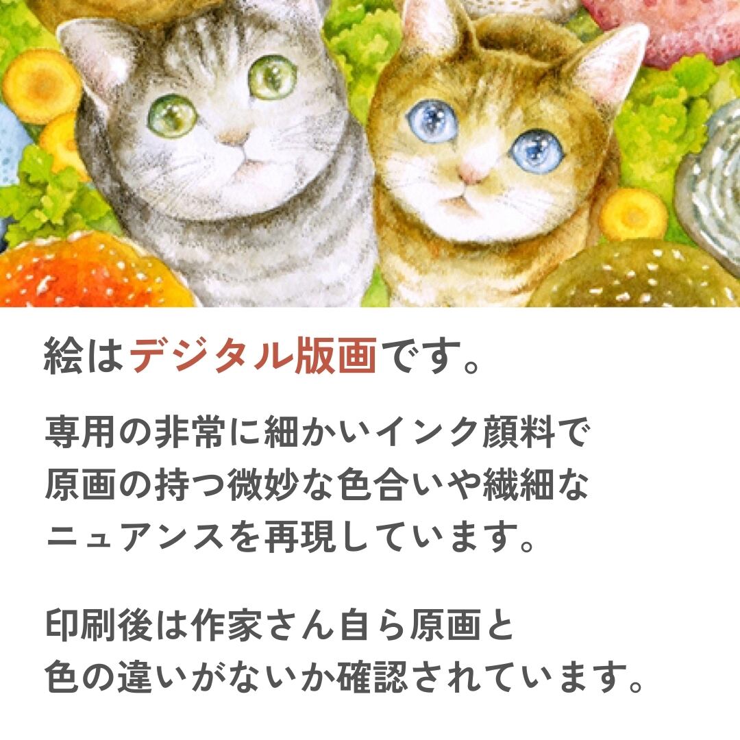 自然の癒しを感じさせるインテリアアートとして、空間に穏やかなリズムと彩りをもたらします。グリーンを基調とした柔らかな色合いは、ナチュラルテイストのインテリアや木製家具とよく調和し、リラックスできる雰囲気を演出します。猫たちの優しい表情は、日々の疲れをそっと包み込み、心に安らぎを与えてくれるでしょう。リビングや書斎など、静かに過ごしたい空間に飾ることで、自然と深呼吸したくなるような心地よさを感じられる一枚です。