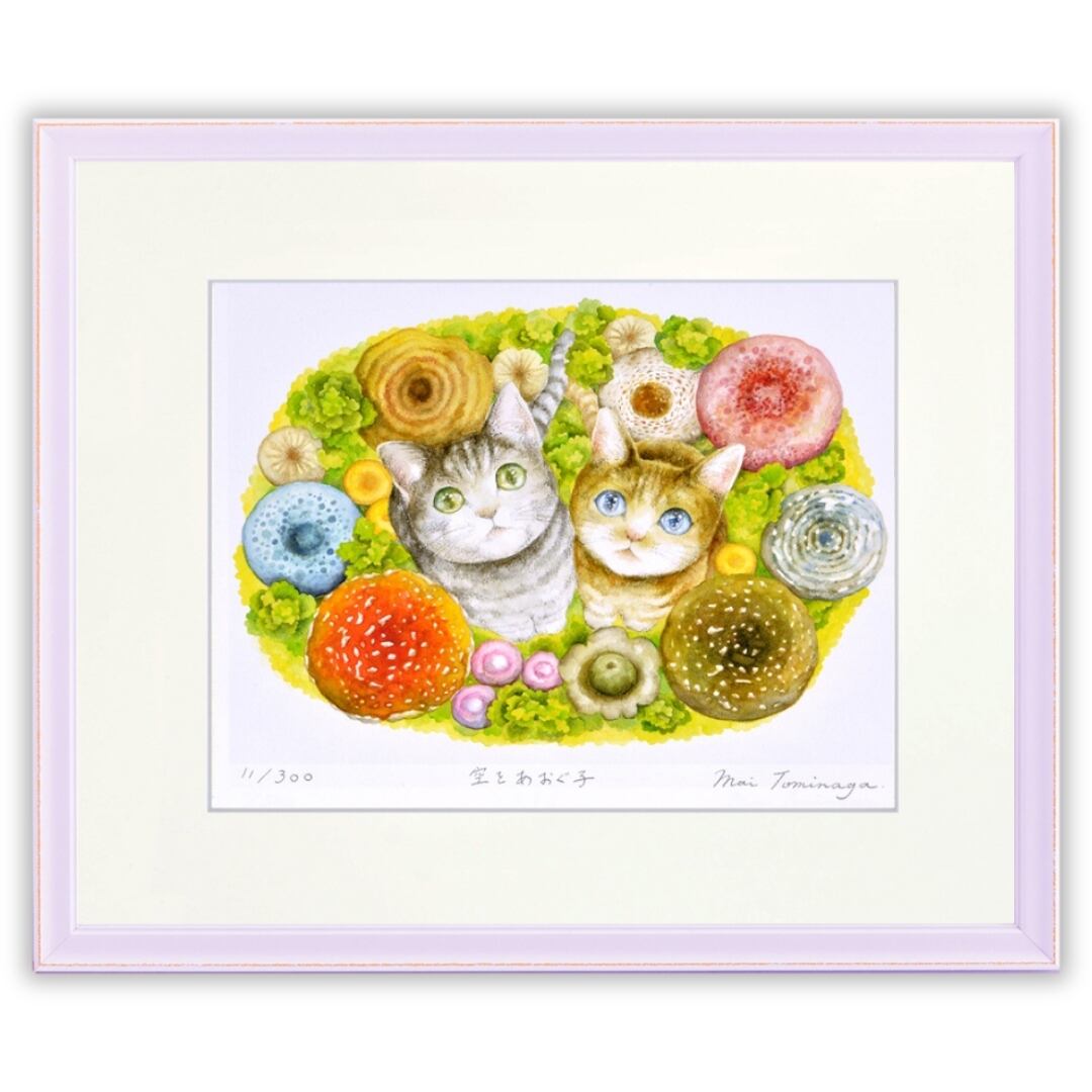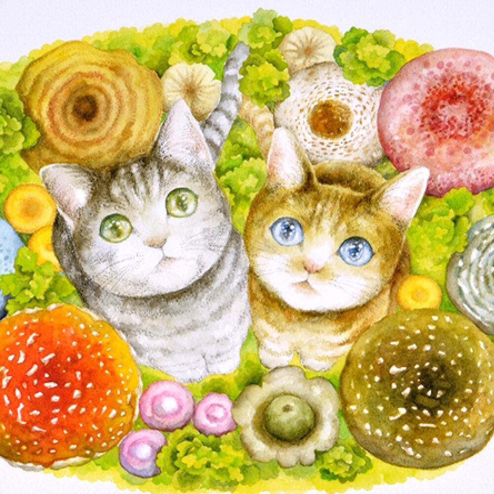 やわらかな光に包まれた森の中で、2匹の猫がまっすぐに空を見上げる姿が印象的です。鮮やかなキノコや苔のグリーンが生き生きと描かれ、自然の奥深さと生命の息吹を感じさせます。猫たちの澄んだ瞳は空の色を映し出し、見る人の心に静かな感動を呼び起こします。細部まで丁寧に描かれた色彩の調和が美しく、幻想的でありながらも優しい現実感を持つ一枚です。穏やかで神秘的な雰囲気に包まれ、眺めるたびに心が澄んでいくような作品です。