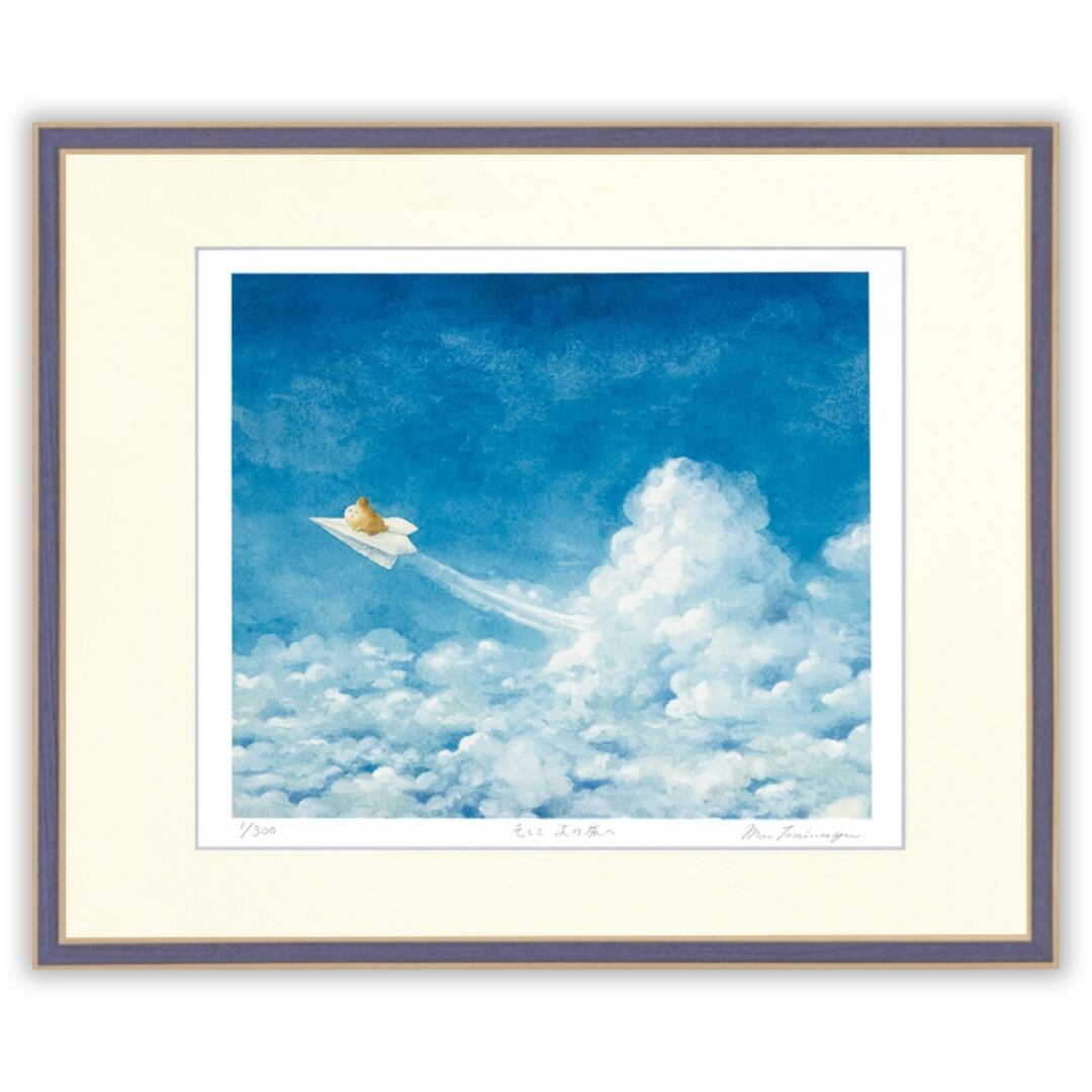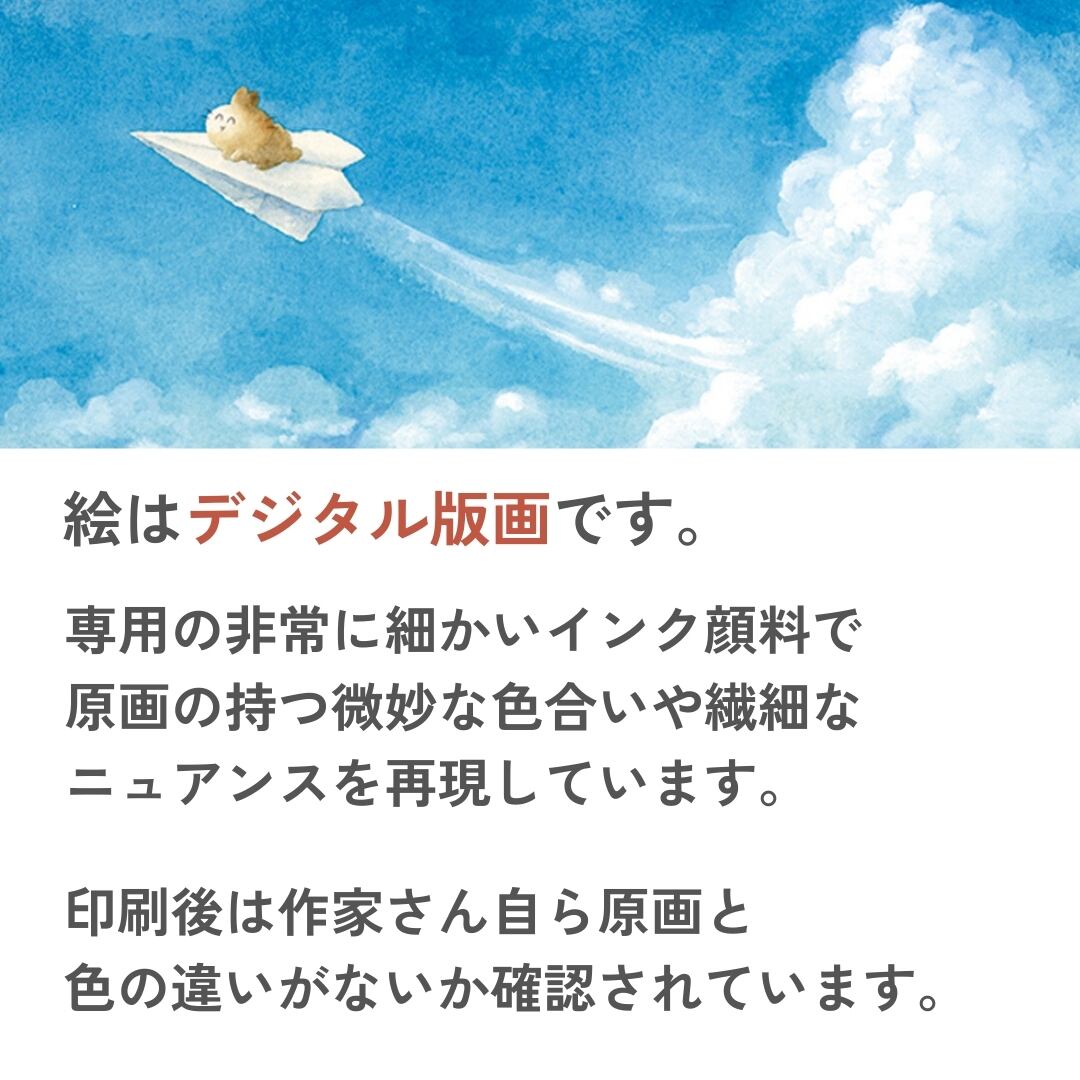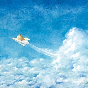 澄みわたる青空の中を、うさぎが紙飛行機に乗って旅立つ姿が描かれています。どこまでも広がる雲海と、その向こうに続く空の深い青が、見る人の心を解き放つようです。うさぎの小さな背中からは、新しい世界へ踏み出す勇気と希望が伝わり、静かな感動を呼び起こします。雲の質感や光の表現が繊細で、まるで風の流れまで感じられるよう。優しくも力強い空の描写が印象的で、心の中に爽やかな風が吹き抜けるような、清々しい一枚です。