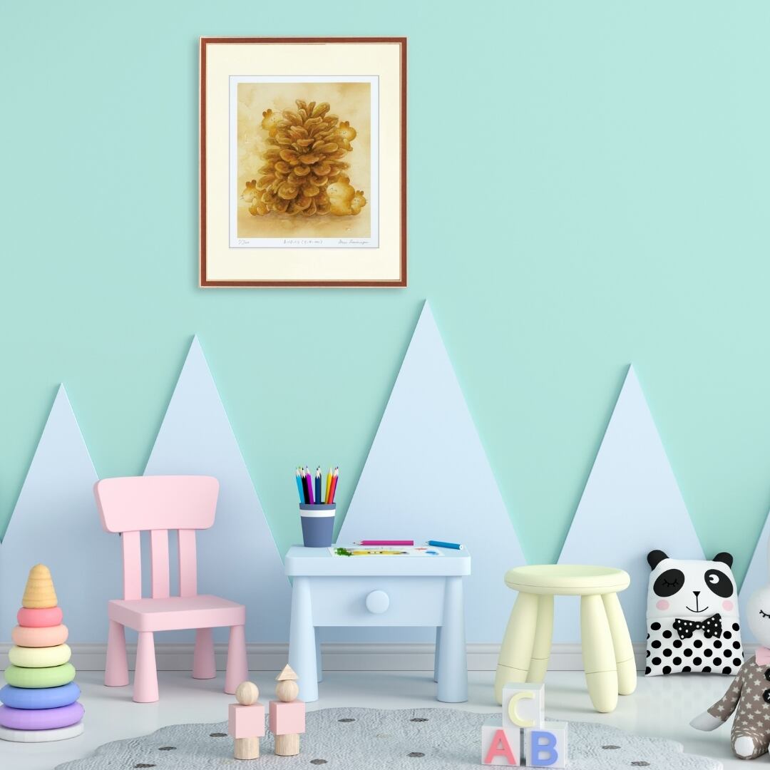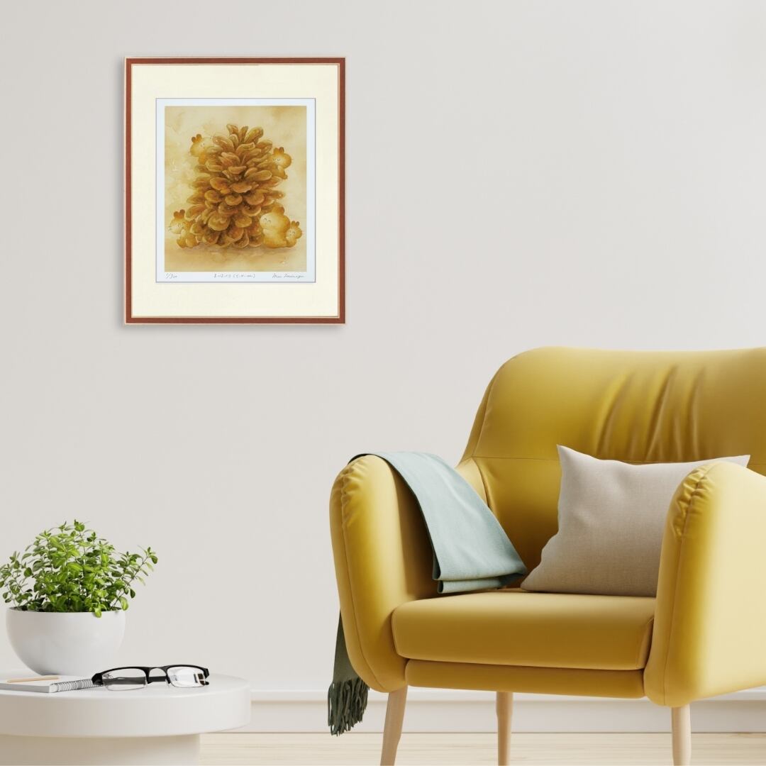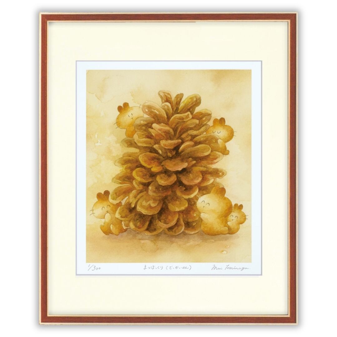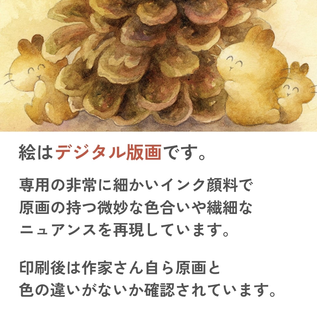 大きな松ぼっくりのまわりに、うさぎたちが集まって楽しそうに見上げる様子が描かれています。やわらかなブラウンと黄みがかった色調が温かく、秋の穏やかな午後の空気を感じさせます。松ぼっくりの細やかな描写には自然のぬくもりが宿り、うさぎたちの丸いフォルムと優しい表情が見る人の心を和ませます。小さな世界の中に大きな発見と喜びがあることを思い出させてくれるような、童心をくすぐる愛らしい作品です。