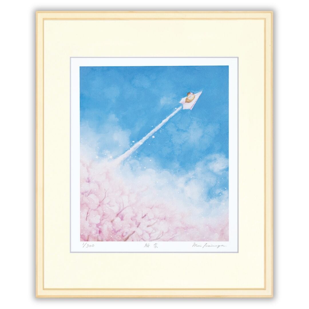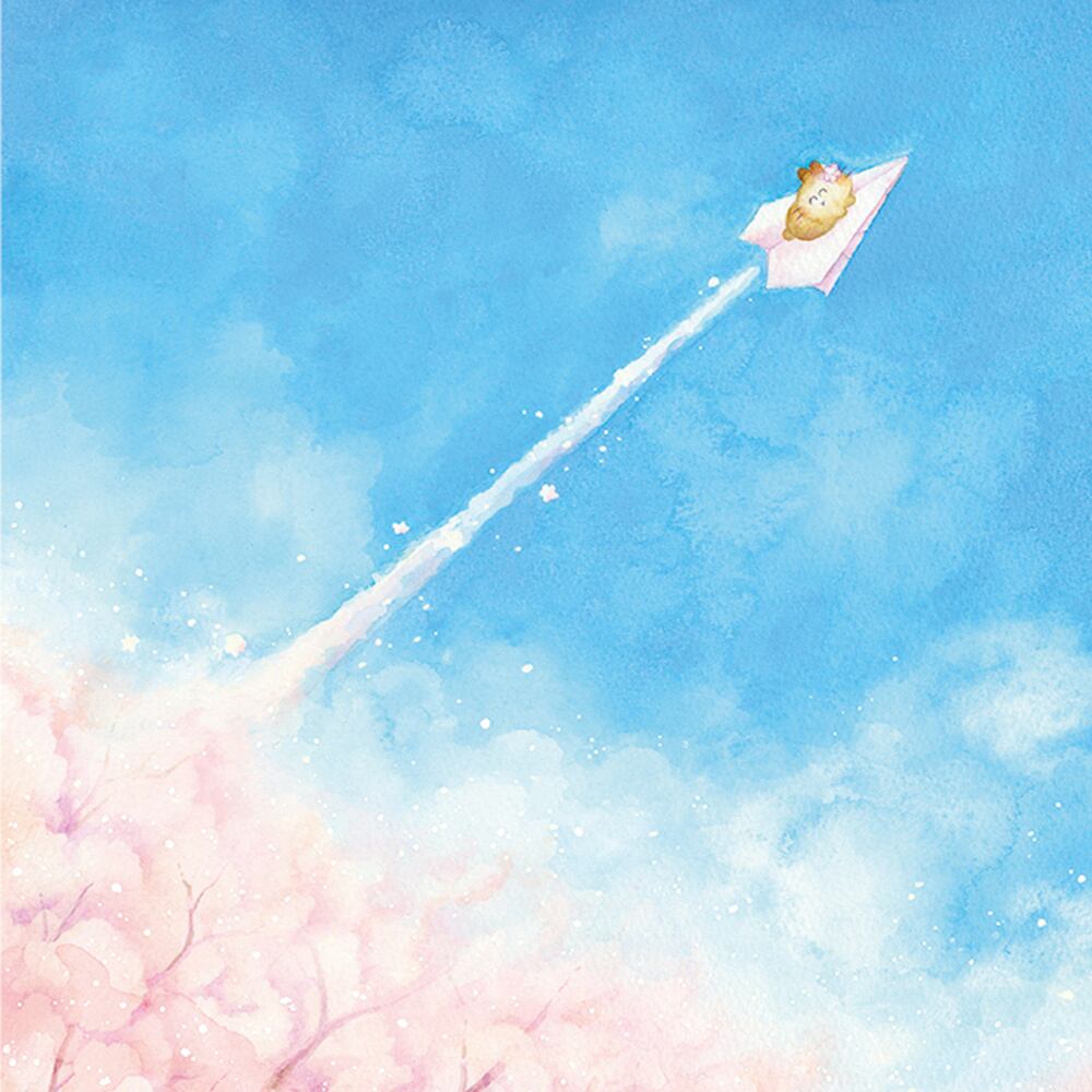 満開の桜の上を、うさぎが乗る紙飛行機が青空へと舞い上がる様子が描かれています。淡いピンクと透き通るような青の対比が美しく、春の空気と軽やかな風を感じさせます。ふんわりとした桜雲の中を突き抜けていく紙飛行機は、まるで新しい季節へと踏み出す希望の象徴のよう。うさぎの表情にはわくわくとした喜びがあふれ、見る人の心にも前向きなエネルギーを届けてくれます。夢と自由が共存する、透明感のある優しい作品です。