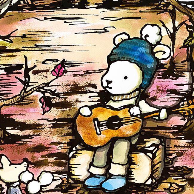 森の中でギターを奏でるクマの姿を描いた、温かみあふれるイラスト作品です。秋色に染まった背景に、落ち葉がひらひらと舞い、小さな動物たちが耳を傾ける穏やかな情景が広がります。柔らかな線と水彩風の彩色が組み合わさり、まるで絵本のワンシーンを切り取ったかのような優しい雰囲気が漂っています。シンプルでありながらも、音楽の楽しさや仲間との心のつながりが感じられ、観る人の心に懐かしさや温もりを呼び覚ましてくれる一枚です。