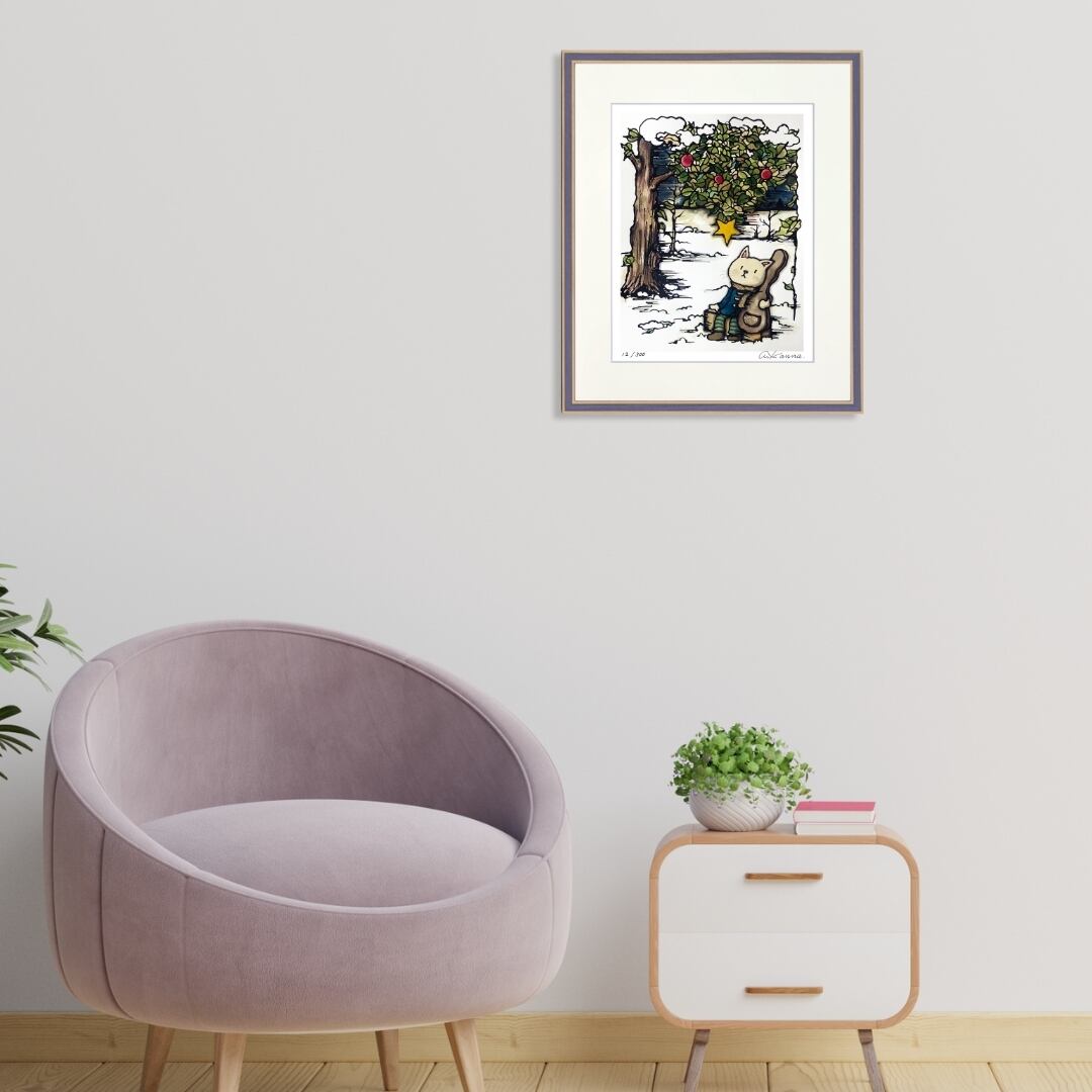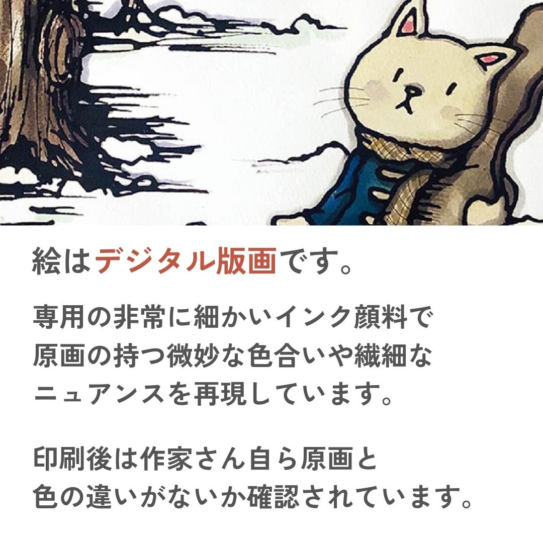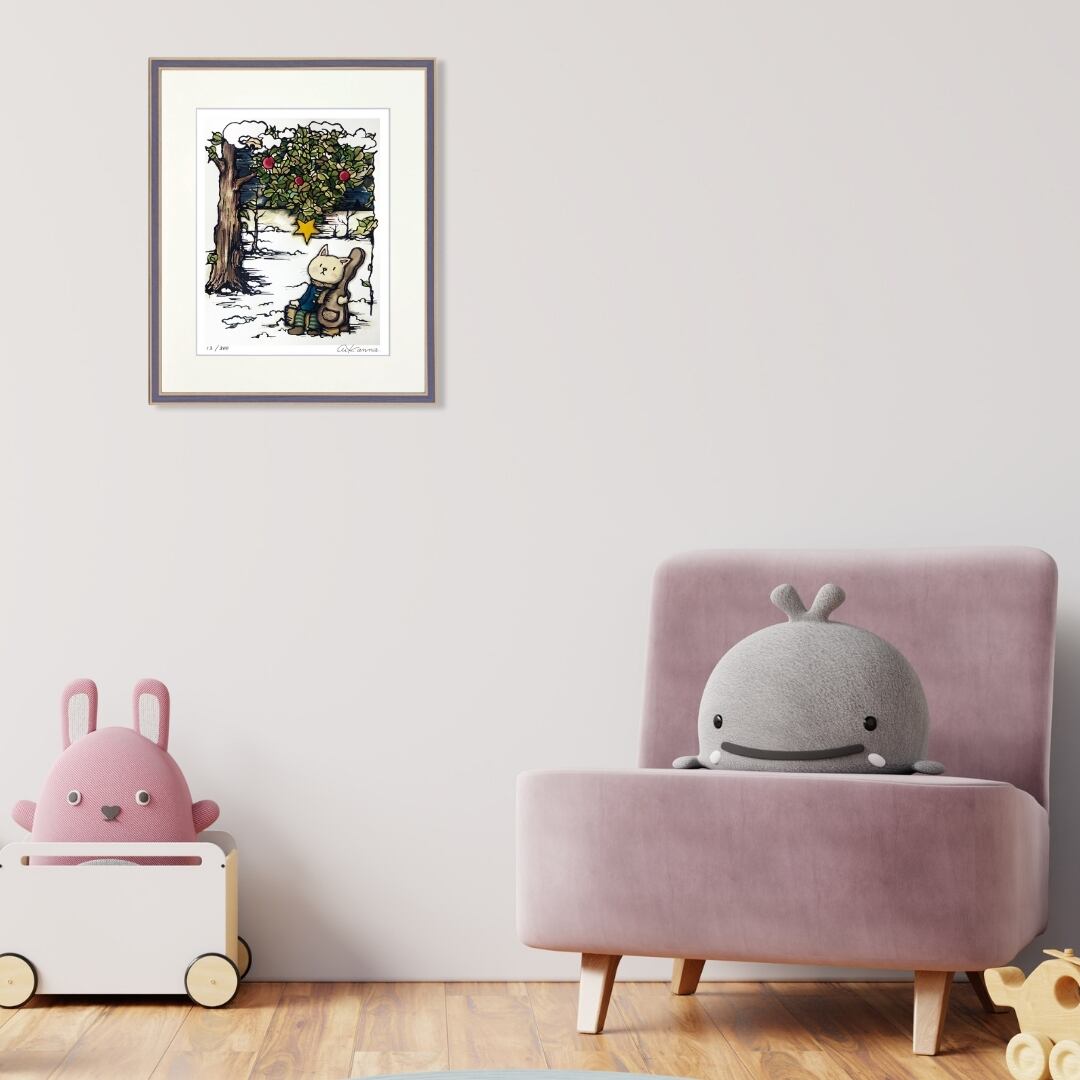 この作品を飾れば、冬の透明感と心温まる物語が同時に感じられる空間を演出できます。雪景色の澄んだ美しさと、猫の穏やかな表情が調和し、お部屋に柔らかな雰囲気をもたらします。リビングや寝室などのリラックスしたい場所に最適で、落ち着いた色合いがインテリアアートとして空間を引き締めつつ、優しい印象を加えてくれるでしょう。額入りアートなのでそのまま飾れて、贈り物としてもおすすめです。日常に癒しをもたらすアート作品として、長く楽しめます。