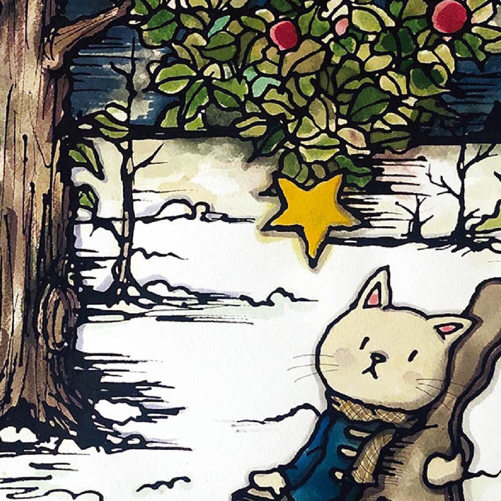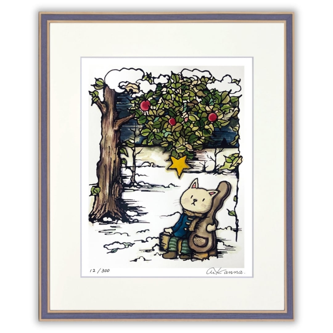 雪景色の中でギターケースを抱える猫の姿が描かれた、温かみのあるイラスト作品です。静かな冬の森を背景に、白銀の世界に凛とした空気が漂い、澄んだ空から輝く星がひときわ印象的に輝きます。猫の穏やかな表情や、ギターと寄り添う姿が、寒さの中にも心を温める物語を感じさせます。木々や雪の質感は繊細に表現され、落ち着いた色調とやわらかな線で構成された世界は、観る人に安心感とぬくもりを与えてくれます。優しさと幻想性をあわせ持つアートです。