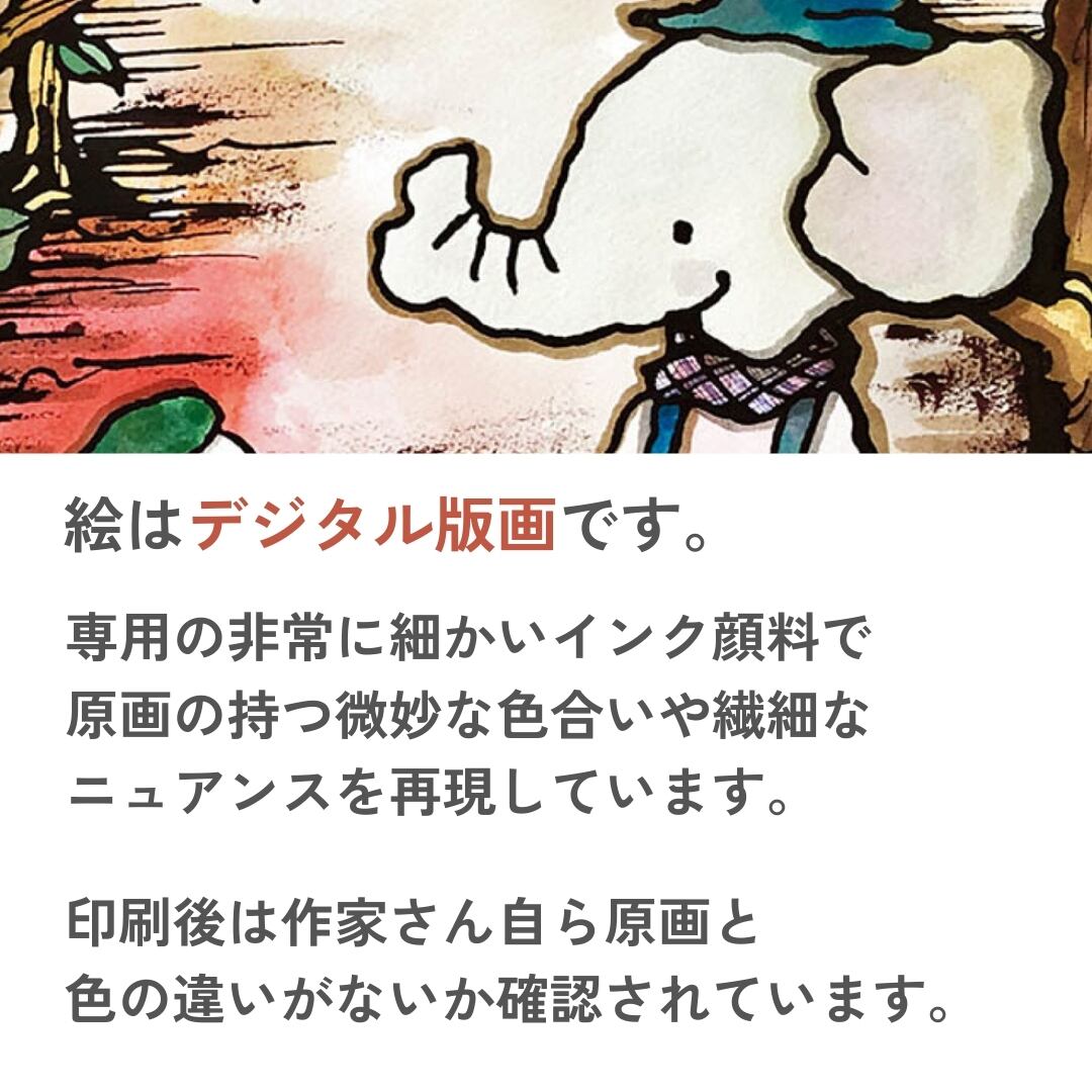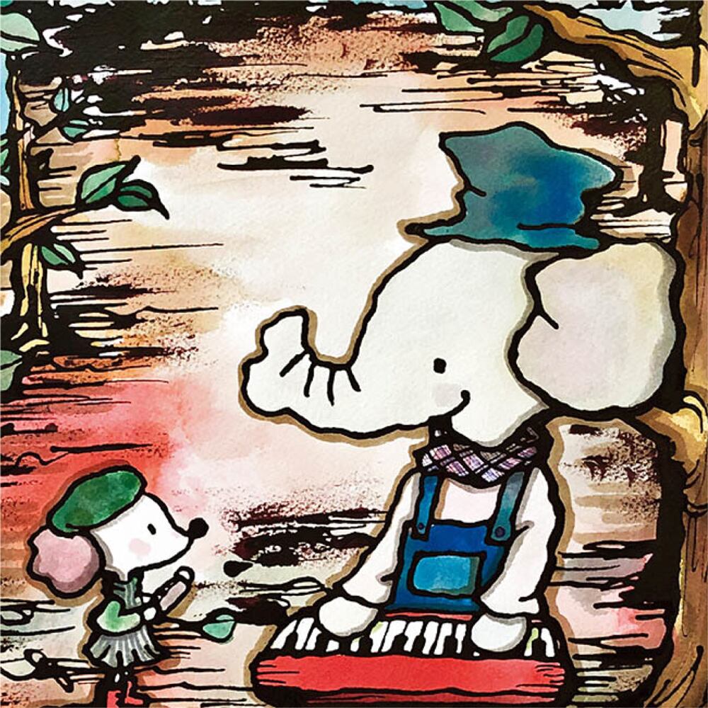 森の中で象と小さな犬が向かい合い、音楽を奏でるひとときが描かれています。ピアノを弾く象の大きな手と、それに合わせて指揮をするように立つ犬の姿が微笑ましく、まるで親子のような温かな関係を感じさせます。背景には木々や青空が広がり、自然と調和するような穏やかな空気が流れています。キャラクターたちの素朴で柔らかな表情は、音楽を通して伝わる心のつながりを象徴し、見る人の心に優しい余韻を残します。やさしい色彩とリズミカルな線が生み出す雰囲気は、日常に癒やしを与えてくれるアート作品です。