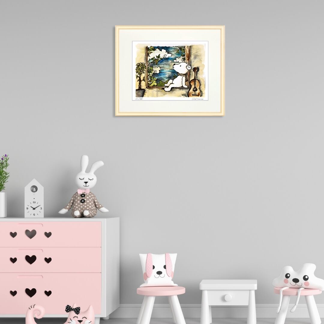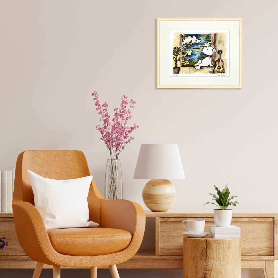 このアートを飾ると、空間に清涼感と落ち着きが広がります。窓の外を眺めるクマの姿は見る人に安らぎを与え、忙しい日常に小さな癒しの時間をもたらしてくれるでしょう。リビングや寝室に置けば、リラックスした雰囲気を演出し、書斎やワークスペースに飾れば、ひと息つくきっかけを与えてくれます。インテリアアートとしても自然に馴染み、優しい色合いがどんな空間にも調和します。心に余白を作り、日々を豊かにしてくれる存在として、暮らしに寄り添う魅力を持った一枚です。