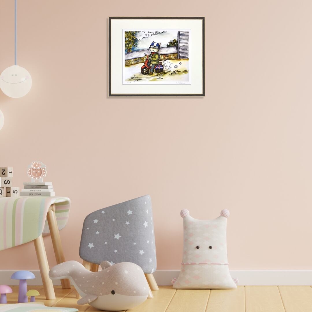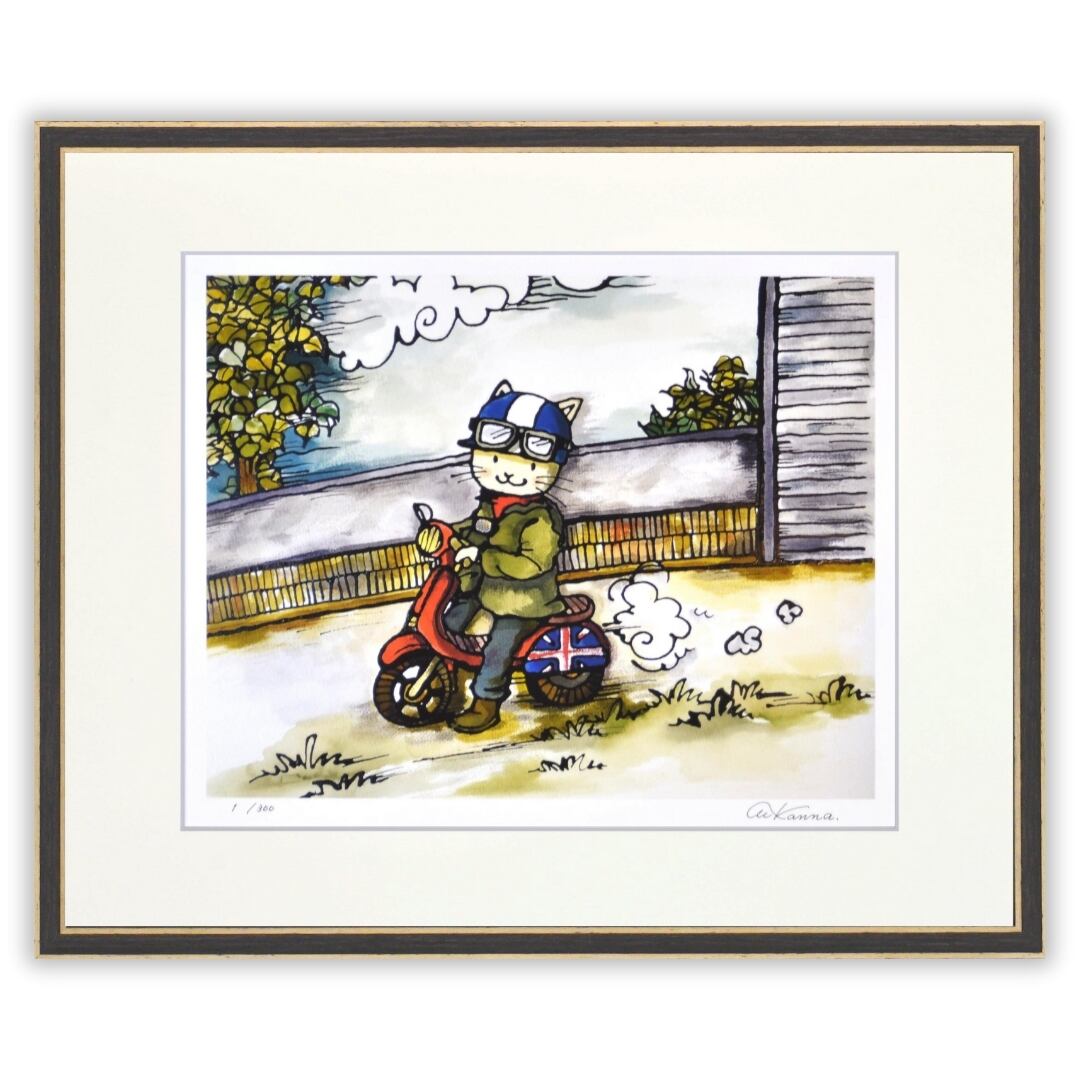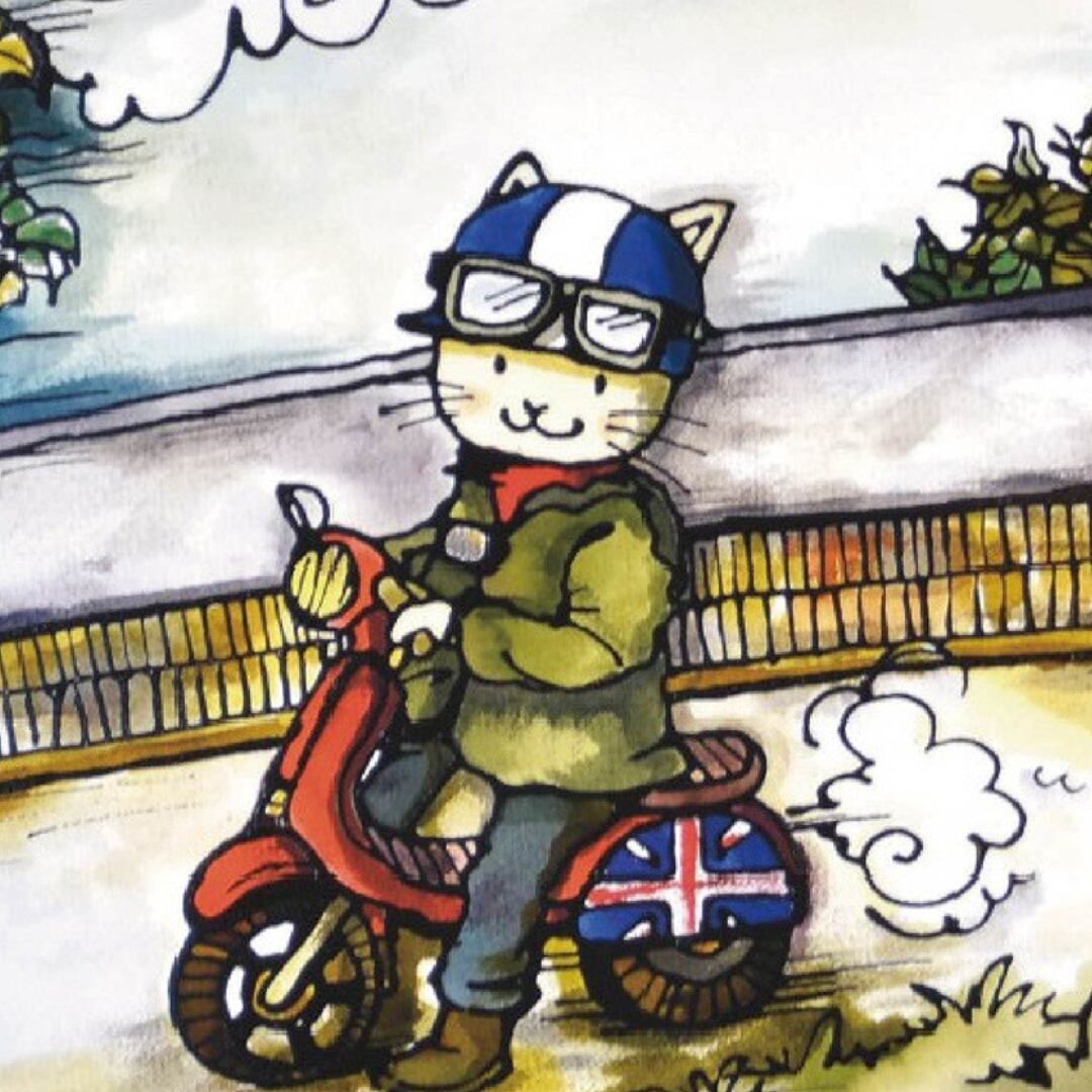 赤いバイクにまたがり、風を感じながら走り出そうとする猫の姿が描かれています。青と白のヘルメットやゴーグル、英国風のデザインが施されたバイクのディテールなど、どこかユーモラスでおしゃれな雰囲気を漂わせています。背景にはのどかな景色が広がり、自由と冒険心を象徴するような光景が広がります。猫の自信に満ちた表情は、見る人に前向きな気持ちを届けてくれ、日常に小さな冒険を呼び込むようです。絵の中に込められた遊び心や軽やかさは、眺めるほどに気分を高めてくれる魅力を持っています。