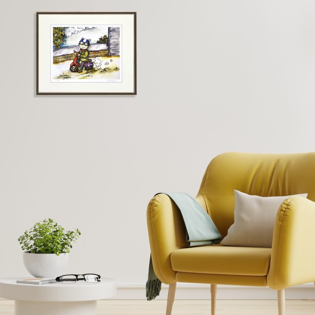 このイラストを飾ることで、空間に明るさとユーモア、そして軽快なリズムを添えることができます。猫がバイクに乗るというユニークな構図はインテリアアートとして個性を際立たせ、リビングや玄関に置けば訪れる人の目を引き、思わず会話が生まれるでしょう。鮮やかな赤と落ち着いた色調のバランスは、ナチュラルな空間にもモダンな空間にも調和します。アートとしての可愛らしさと同時に、前向きな気分を与えてくれる作品なので、日常をもっと楽しく彩るアクセントとしておすすめです。