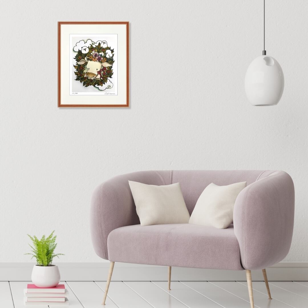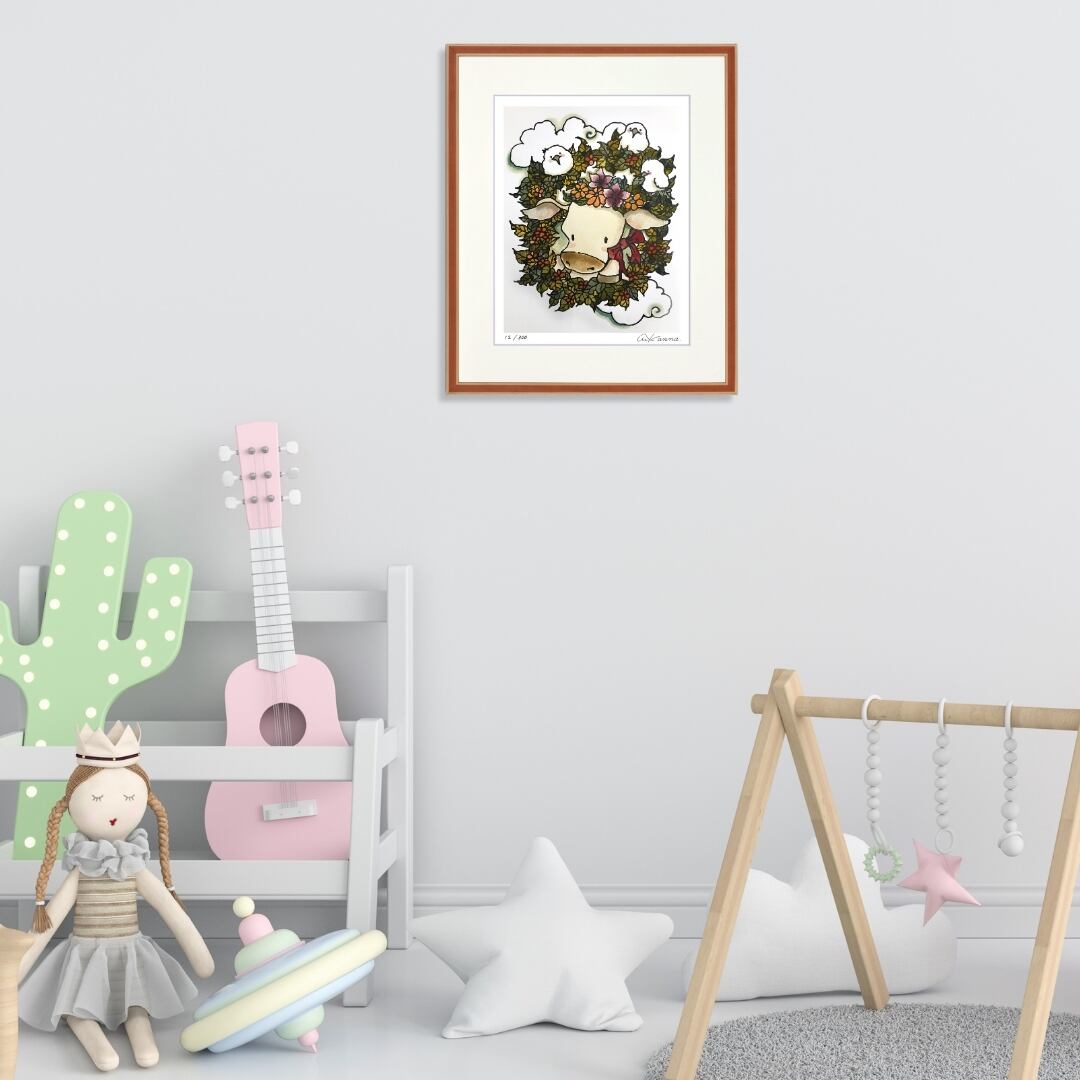 この作品は、お部屋にほっとするような温もりを届けてくれる一枚です。リースモチーフの華やかさが季節感を演出し、特に冬やクリスマスのインテリアとしてぴったりですが、一年を通して空間を彩るアクセントにもなります。牛のキャラクターが持つ穏やかで優しい雰囲気は、見る人に安心感や癒しを与え、家族が集うリビングや玄関に飾れば、訪れる人々の心を和ませてくれるでしょう。明るい花々と小鳥たちの存在は、日常に自然の温かみを取り入れる効果もあり、空間全体を優しく包み込んでくれます。