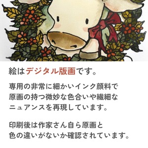 中央に描かれているのは、リースの中から顔をのぞかせる愛らしい牛のキャラクターです。リースは赤や緑を基調とした葉と花々で飾られ、鮮やかなオレンジやピンクの花がアクセントになっています。さらに周囲には小鳥たちが楽しげに舞い、雲のモチーフがふんわりと取り囲むことで、温かく優しい雰囲気を醸し出しています。牛の穏やかな表情と、赤いリボンのワンポイントが華やかさを添え、祝祭的でありながらどこか牧歌的な印象を与えてくれる作品です。ユーモラスでありながらも優美なデザインが魅力の一枚です。