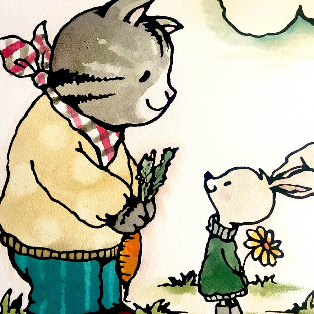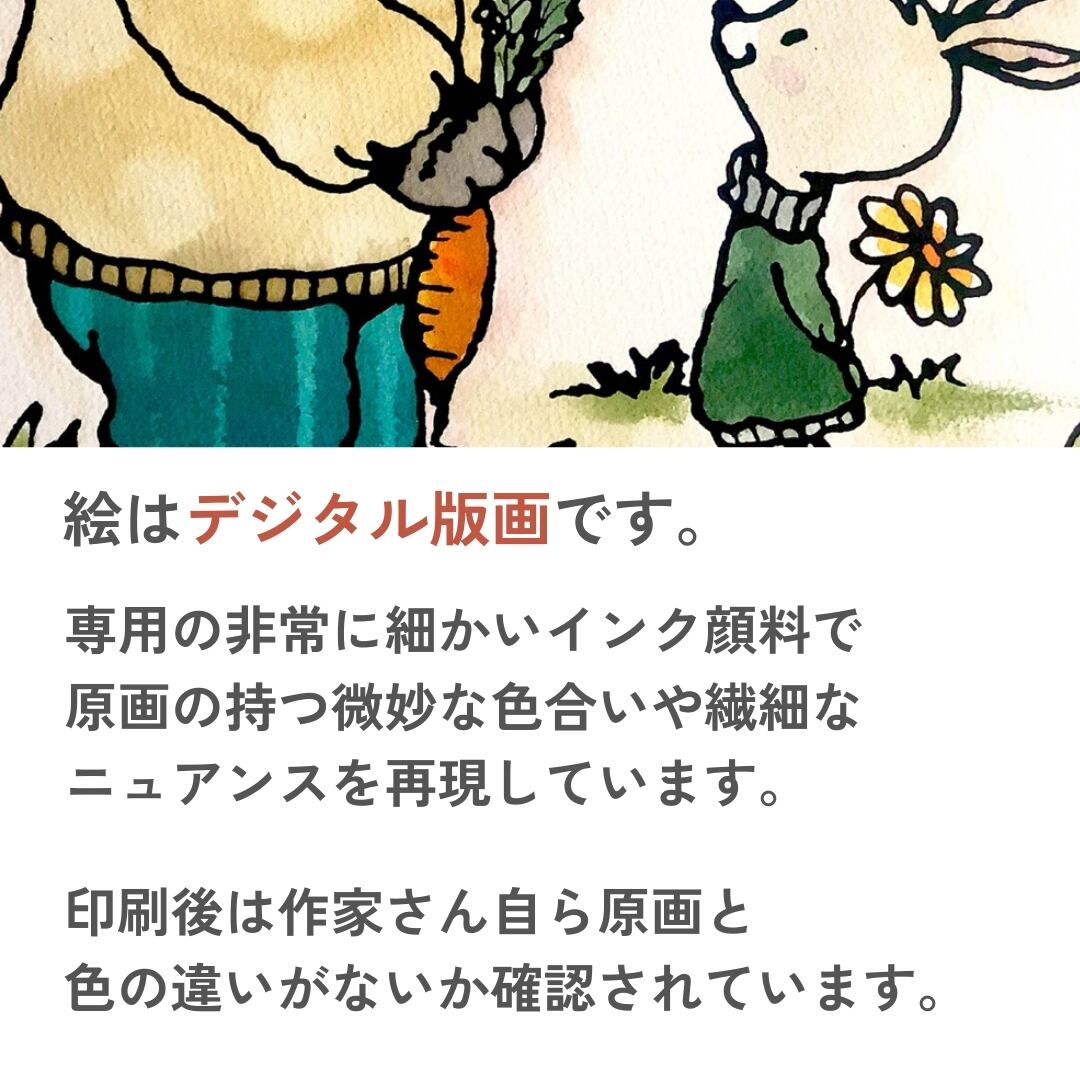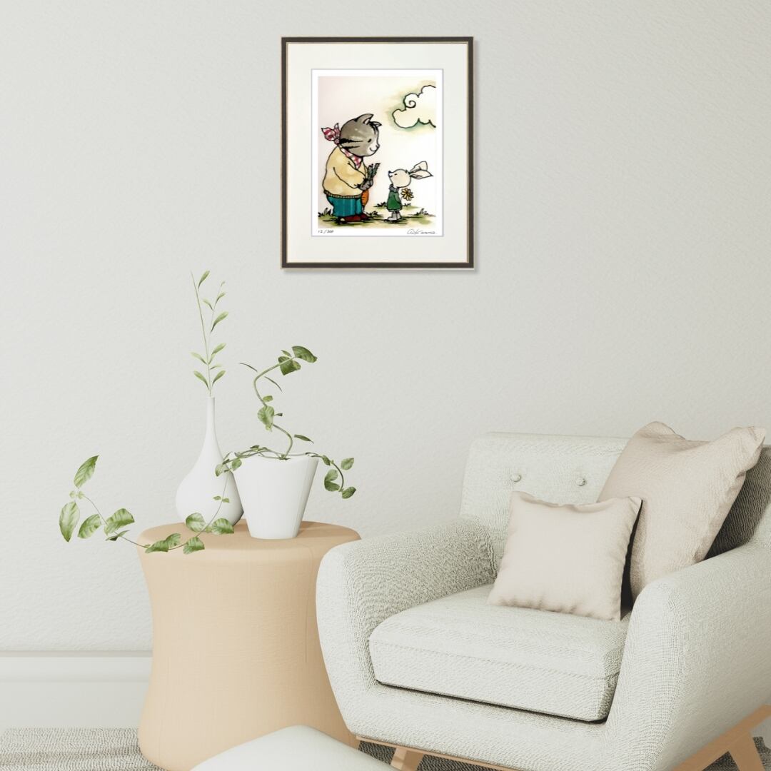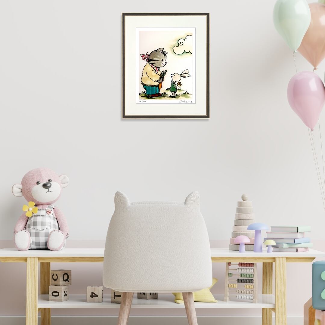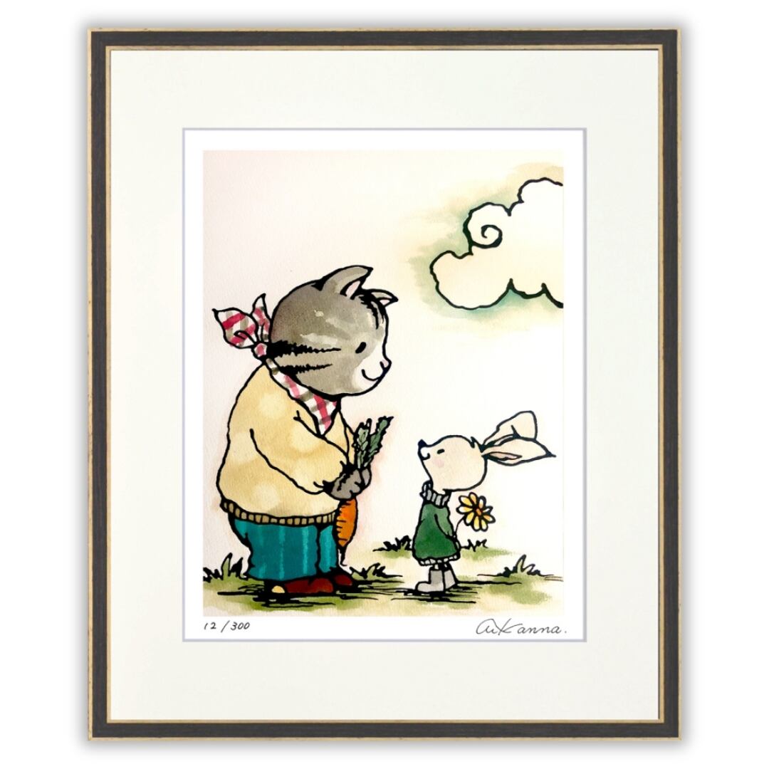 「プレゼントあげる」は、心のこもった贈り物を交わす温かな瞬間を描いた作品です。首にスカーフを巻いた猫が、にんじんを手にして微笑む姿。そしてその前で背中に花を隠しながら照れくさそうに立つうさぎの姿が、とても愛らしく表現されています。お互いを思いやる気持ちが絵全体に溢れていて、贈り物そのものよりも「相手を想う心」が一番のプレゼントであることを伝えてくれるようです。見る人の心をやわらかくし、思わず微笑みたくなる一枚です。